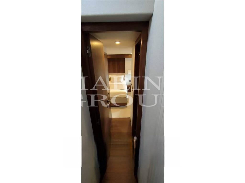 4 cabine doppie, 4 bagni + cabina marinaio doppia; elegante stile classico con utilizzo di materiali moderni e di altissima qualità; cabina armatoriale a centro barca a tutto baglio con bagno ensuite; cabina VIP a prua con letto matrimoniale e bagno privato; terza cabina ospiti con letti singoli in piano e bagno dedicato; quarta cabina con letti singoli a castello con quarto bagno dedicato; cabina marinaio doppia con bagno completo.