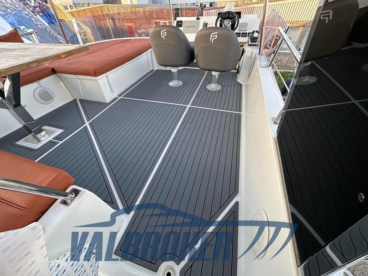 Legno di rovere chiaro, finitura satinata, moquette sui pavimenti, Due sedili Bolster regolabili, Timoneria idroelettrica servoassistita,Piani di lavoro in Corian,Scala in teak per il flybridge