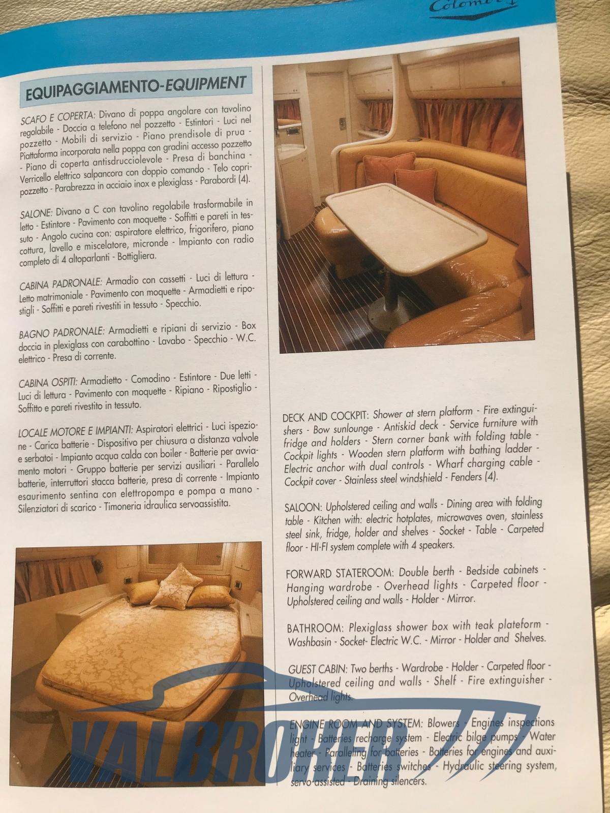 Colombo 44 motorizzata con 2x450 HP Cummins 6 cilindri in linea d'asse turbo diesel con solo 450 ore. Venduta nuova sul Lago di Como, usata due mesi l'anno in Sardegna poi sempre in capannone. Unico proprietario sino al 2021. Cabina armatoriale a prua con letto matrimoniale e seconda cabina con letti a castello e bagno separato. Refit completo eseguito su Lago di Como da Yacht Service di Paolo Meroni tra il 2022 e il 2023. 2023: nuova pompa oleodinamica su passerella e nuova centralina. Ottobre 2024: eseguita antivegetativa su scafo e flap e trattamento prop speed su assi e eliche. Eseguito tagliando completo motori e generatore ( filtri gasolio, prefiltri, giranti, olio invertitore, filtri invertitori, olio invertitori, olio motore, guarnizione turbine, revisione pompa acqua mare). Marzo/Aprile 2026: aftercooler destro nuovo, nuovo serbatoio acque nere, nuovo mobiletto esterno, revisione climatizzatore, nuova batteria del generatore.
