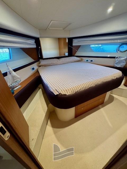 Salendo a bordo, a destra si trova la cucina perfettamente attrezzata e posizionata a poppa e pensata per un armatore che vive la barca in prima persona. A sinistra comodo mobile contenitore con ante e sempre a sinistra un ampio divano ad angolo, molto profondo e dotato di tavolo alto allungabile, che permette di accomodare fino a 6 persone; a proravia della cucina si trova un altro divano con doppia seduta, la zona notte presenta soluzioni normalmente adottate per imbarcazioni di dimensioni maggiori, con tre cabine doppie, due con letto matrimoniale ed una con due letti singoli.