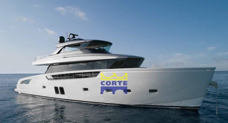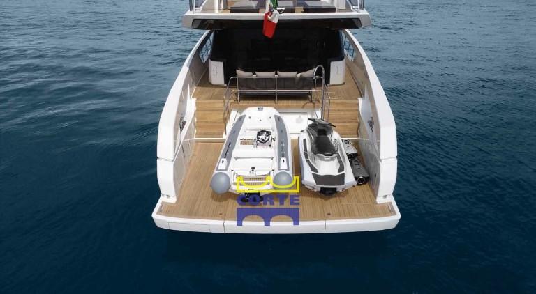 Pacchetto Raymarine diamond navigation, prese stagne, 4G wi-Fi, TV circuito chiuso. pavimento fly in teak, impianto Wi Fi, cristalli laterali fly apribili eletticamente, aria condizionata fly, piattaforma centrale beach area con movimento elettrico, filtro a carboni attivi per acqua dolce, tavolo dinette con saliscendi manuale, tavolo fly con saliscendi elettrico, 2° generatore da 28 kw, piano cottura sul fly, modifica zona equipaggio con spostamento elettrodomestici, parquet corridoio lower deck, tende elettriche salone e cabine master, mobile aggiuntivo sul fly.