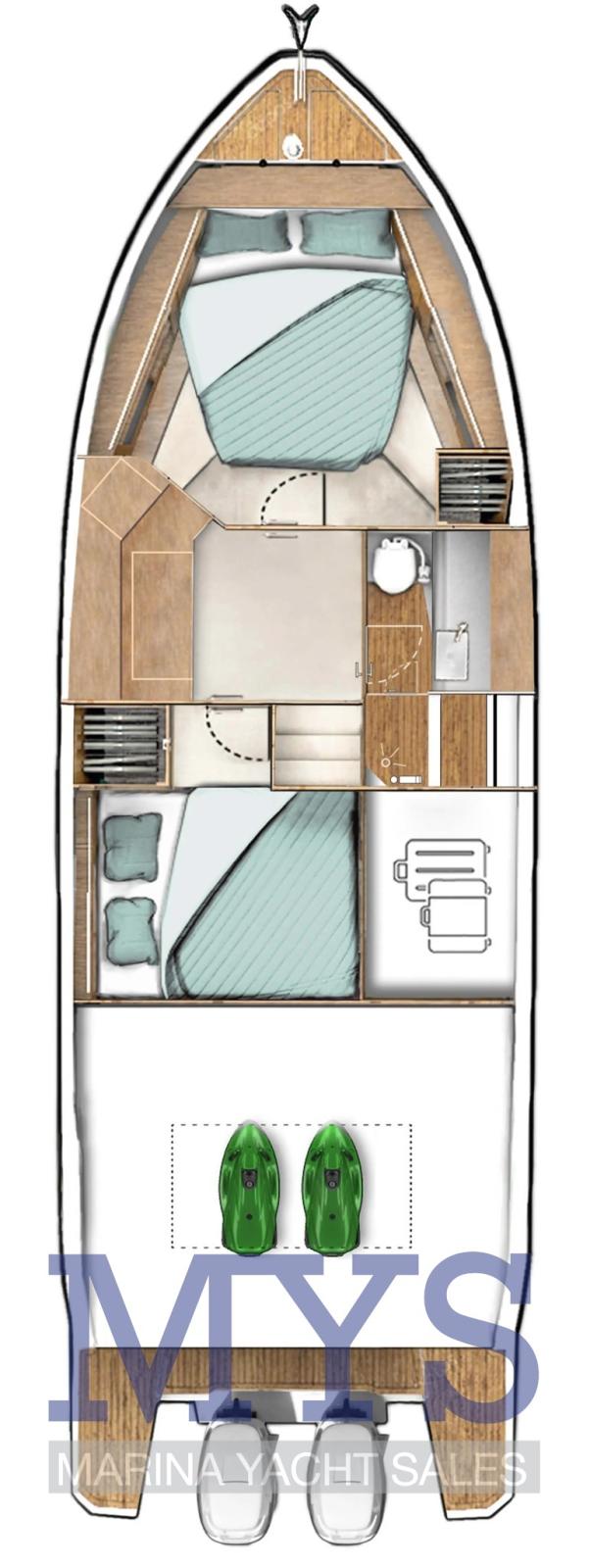 Layout sotto coperta con cabina armatoriale a prua e cabina ospiti separata.