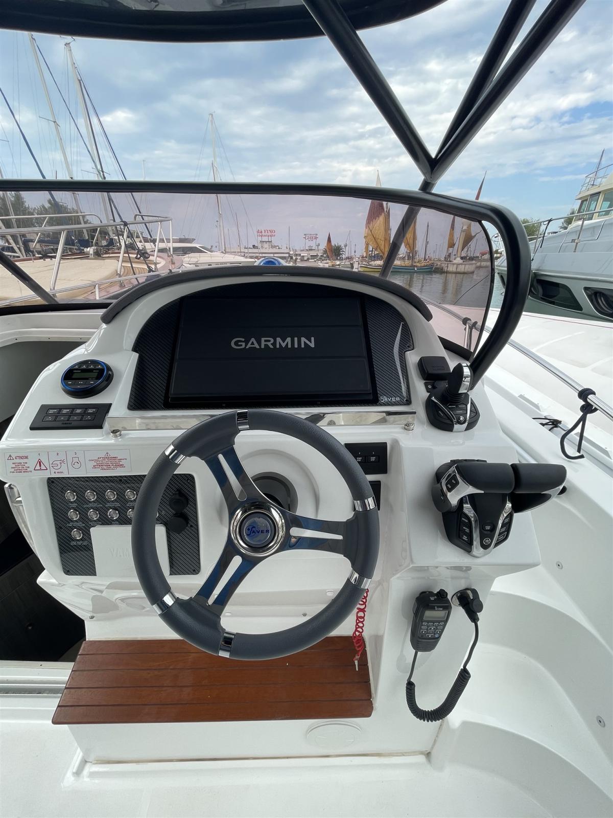 Comando motori elettronico, Computer di bordo, Contametri catena, Joystick, Plotter con antenna GPS (Garmin 16), Radio VHF (Icom).