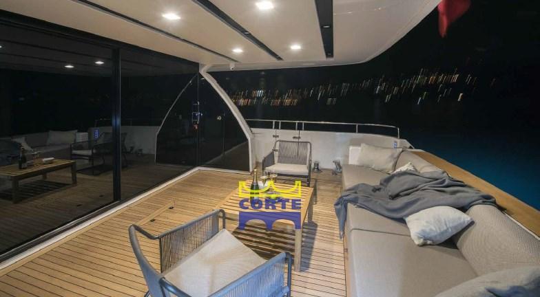 Allarme fumo/gas, Allarme motore, Allarme sentina, Asse di rispetto, Autoclave, Bocche di Lupa, Camminamenti laterali in teak, 2 Caricabatterie, Doccia esterna (con colonna doccia inox), Doppia timoneria, Elica di poppa - stern thruster (elettrica maggiorata a 20 Kw), Elica di rispetto, Faro orientabile, Flap elettrici, Garage per tender, Hard top (con tetto apribile elettrico a lamelle), Impianto antincendio, Luci di cortesia, Luci subacquee, Passerella (elettroidraulica a scomparsa), Piattaforma (di poppa), Pompa di sentina automatica, Porta ingresso, Porta laterale, Pozzetto Teak, Presa 220V banchina, Presa acqua banchina, Salpa Ancore Elettrico, Scala reale (rimovibile con aggangi su entrambi i lati), Scaletta da bagno, Stabilizzatori (pinne stabilizzatrici elettriche Zero Speed (all'ancora e in navigazione)), Tavolo pozzetto, Tromba, 2 Winch tonneggio di poppa, Winch tonneggio di prua.
