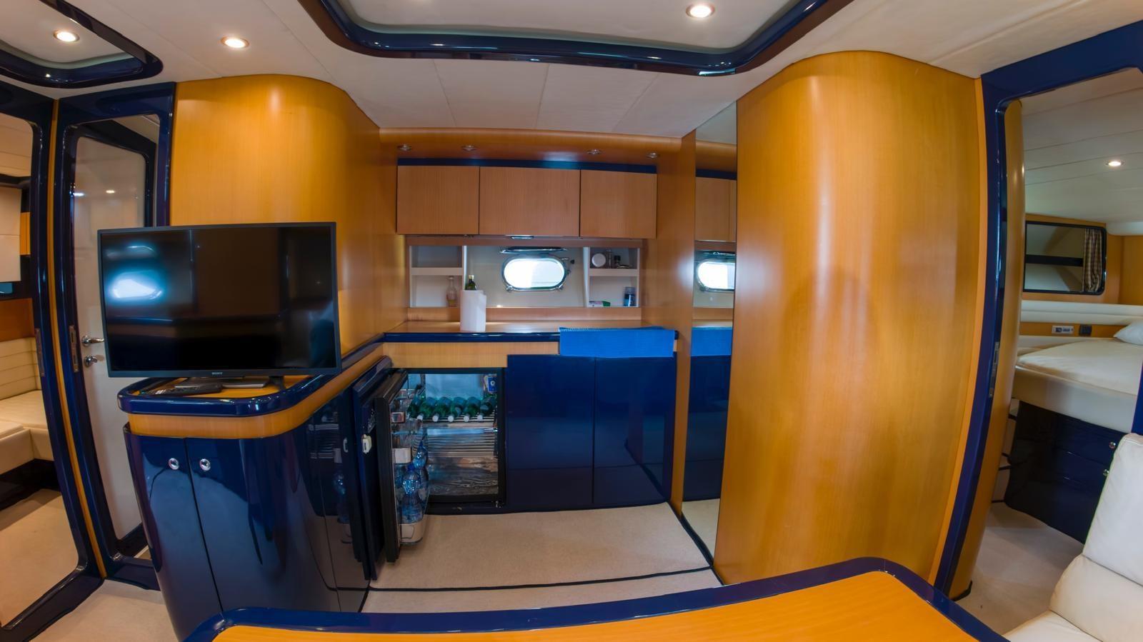 Allarme fumo/gas, Allarme motore, Allarme sentina, Autoclave, 6 Batterie, Doccia esterna, Flap idraulici, Impianto antincendio, Indicatori Flaps, Lavaggio catena, Lavandino nel Pozzetto, Luci di cortesia, Passerella (Idraulica Besenzoni), Piattaforma, Pompa di sentina automatica, Pompa di sentina manuale, Presa 220V banchina, Rollbar, Salpa Ancore Elettrico, Scaletta da bagno, Tavolo pozzetto, Winch tonneggio di poppa.