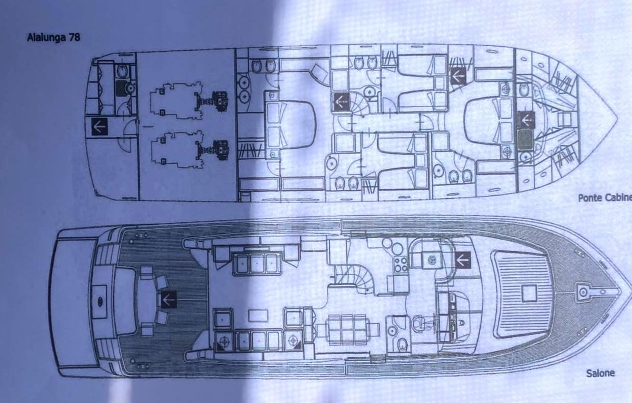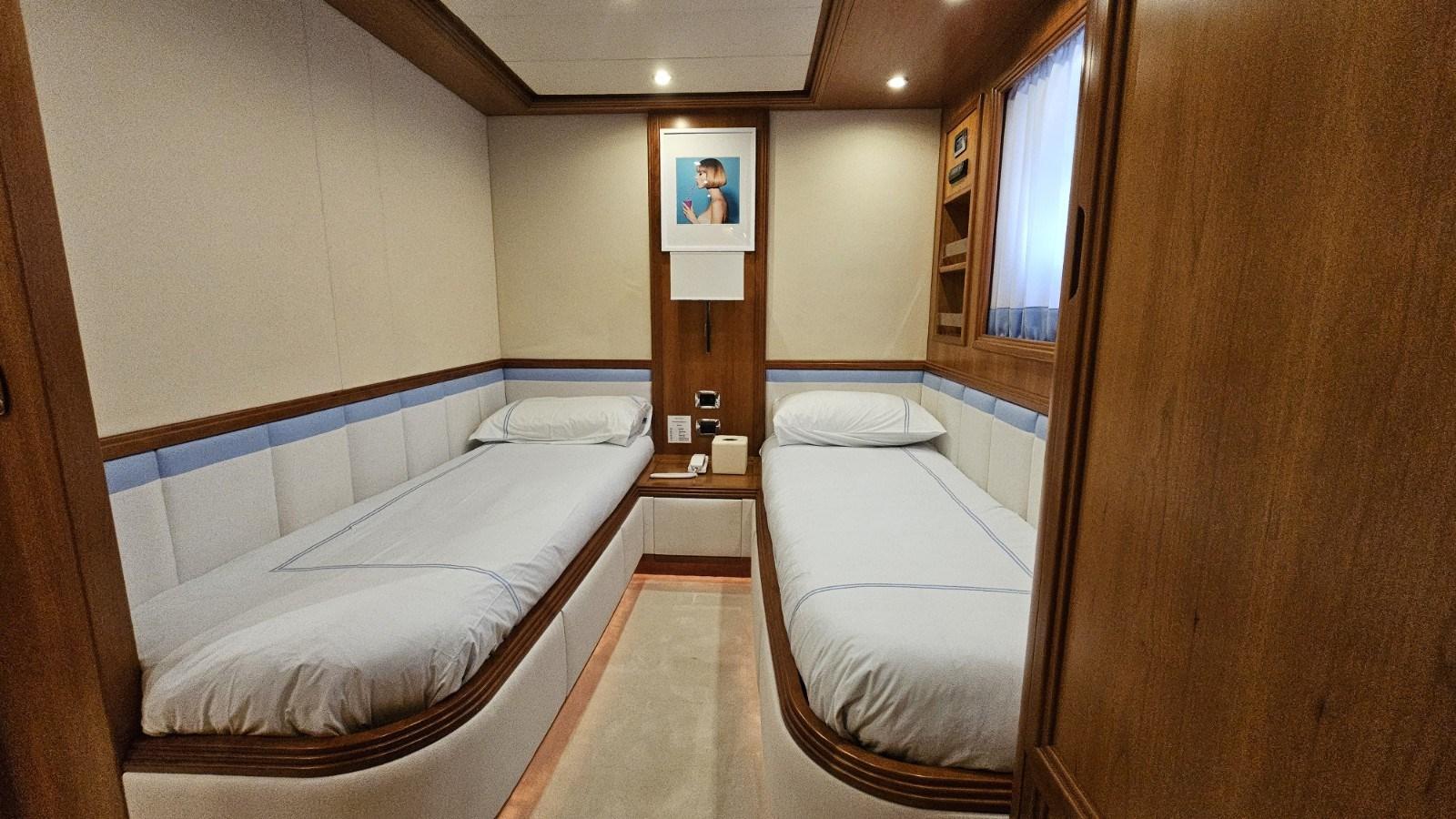 Cabina armatoriale con letto matrimoniale, cabina armadio, bagno con doccia sepatata - cabina Vip con letto matrimoniale, cabina armadio, bagno con doccia separata - cabina ospiti con due letti in piano, bagno con doccia separata - cabina ospiti con due letti in piano, bagno con doccia separata.