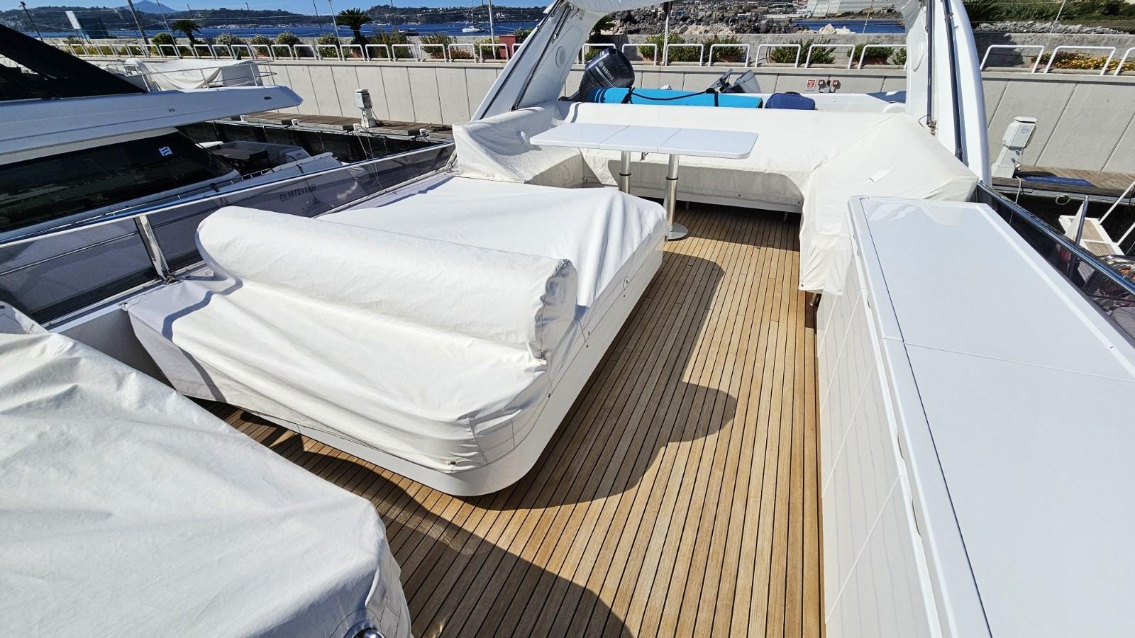 Allarme motore, Allarme sentina, Autoclave, Bocche di Lupa, Camminamenti laterali in teak, Doccia esterna, Doppia timoneria, Faro orientabile, Flap idraulici, Gruette per tender su fly, Impianto antincendio, Indicatori Flaps, Lavaggio catena, Luci di cortesia, Luci subacquee, Passerella, Piattaforma, Porta ingresso, Porta laterale, Pozzetto Teak, Presa 220V banchina, Presa acqua banchina, Ripetitore strumentazione, Rollbar, Salpa Ancore Elettrico, Scaletta da bagno, Selle per Tender, Tavolo pozzetto, Tender, Tientibene con cancelletti, Tromba, Winch tonneggio di poppa.