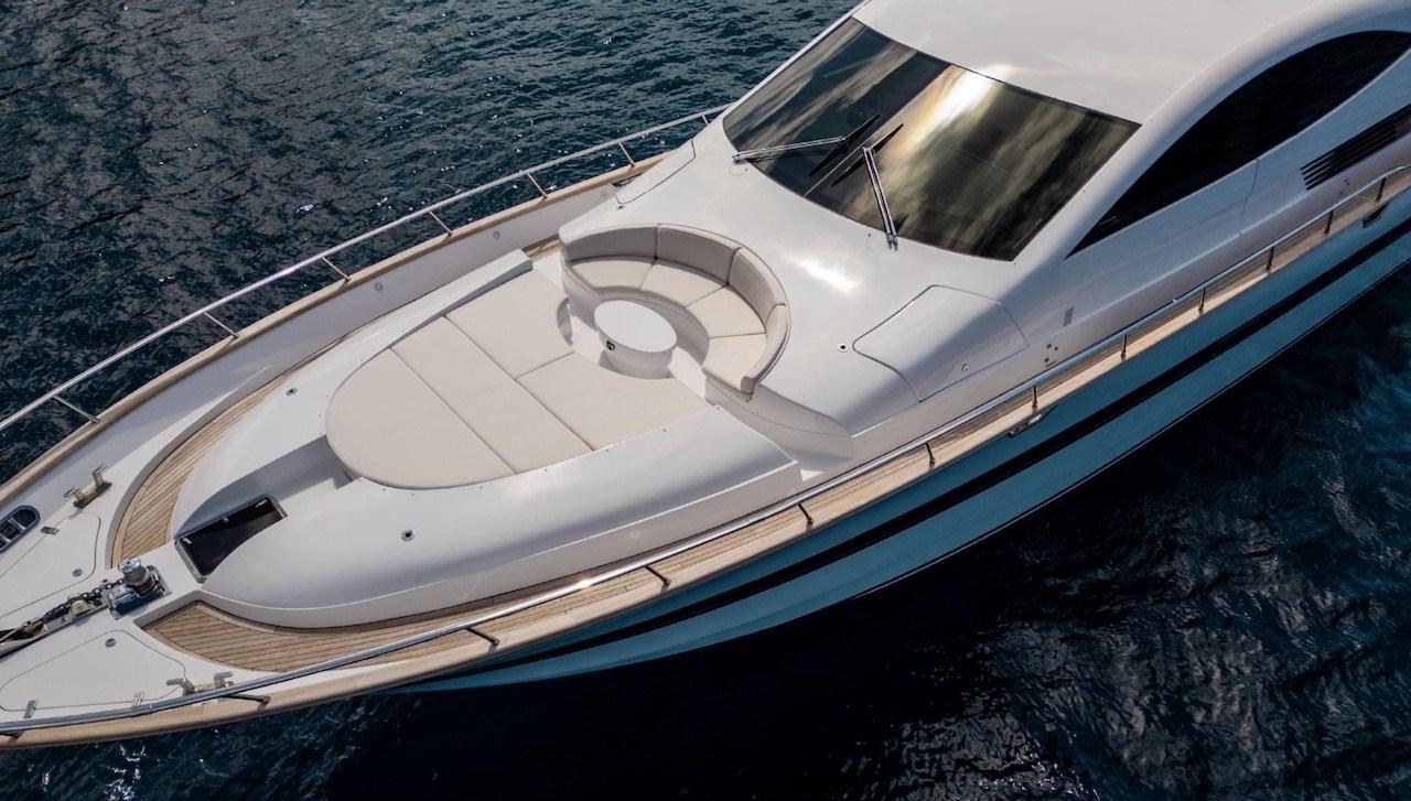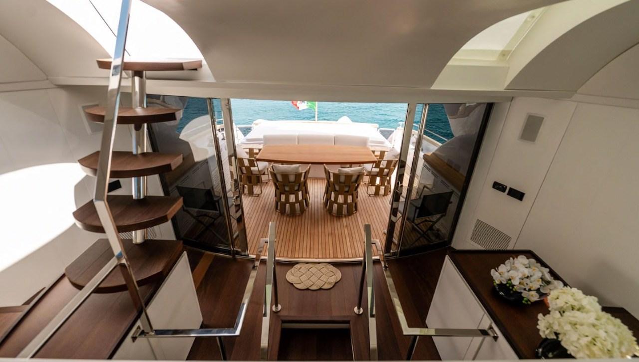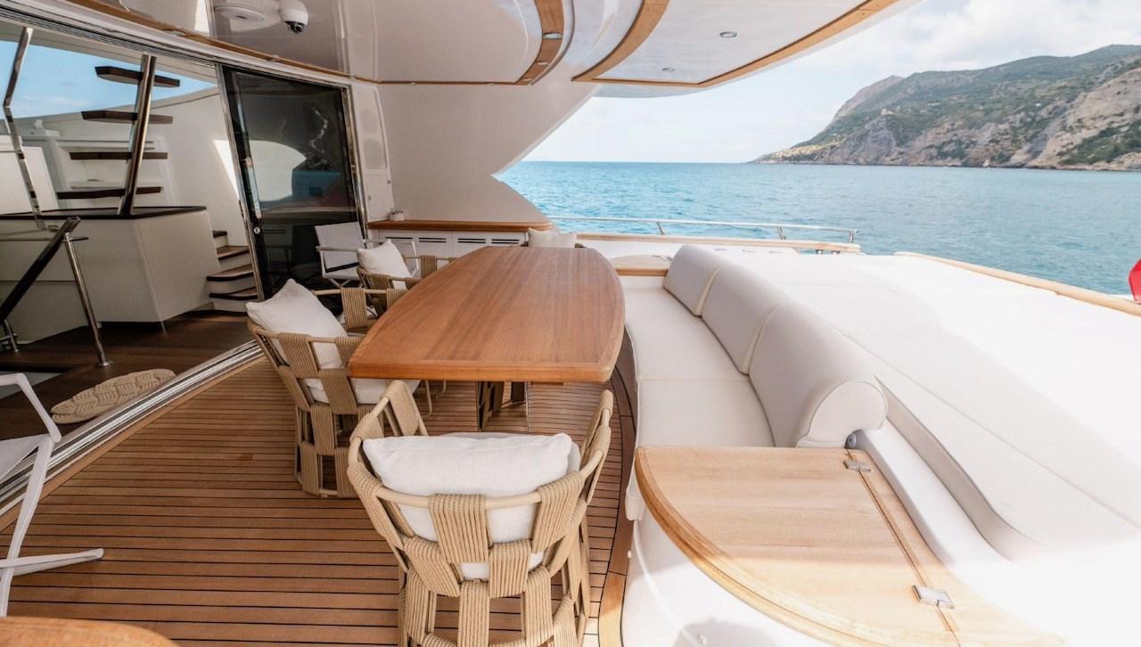 Allarme motore, Allarme sentina, Autoclave, Bocche di Lupa, Camminamenti laterali in teak, Doccia esterna, Doppia timoneria, Flap idraulici, Gruette per tender, Impianto antincendio, Indicatori Flaps, Luci di cortesia, Luci subacquee, Passerella, Piattaforma, Porta ingresso, Porta laterale, Pozzetto Teak, Presa 220V banchina, Presa acqua banchina, Raddrizzatore, Rollbar, Salpa Ancore Elettrico, Scaletta da bagno, Selle per Tender, Tavolo pozzetto, Tender, Tientibene con cancelletti, Tromba, Winch tonneggio di poppa, Winch tonneggio di prua.