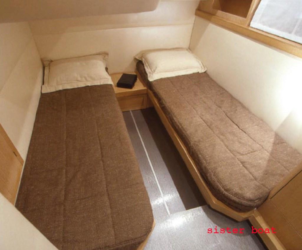 Cabina armatoriale con letto matrimoniale e bagno - cabina ospiti con due letti in piano - cabina ospiti con letto matrimoniale - bagno ospiti a centro barca con doppia porta - dinette interna con tavolo e divano, divano trasformabile in letto ad una piazza e mezza.