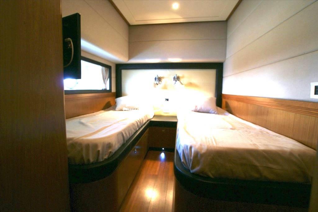 Cabina armatoriale a centro barca con letto matrimoniale e piccola cabina armadio, bagno a tutto baglio con doccia separata - cabina Vip con letto matrimoniale e bagno - cabina ospiti con due letti in piano - cabina ospiti singola - bagno ospiti - due cabine equipaggio singole - bagno equipaggio.