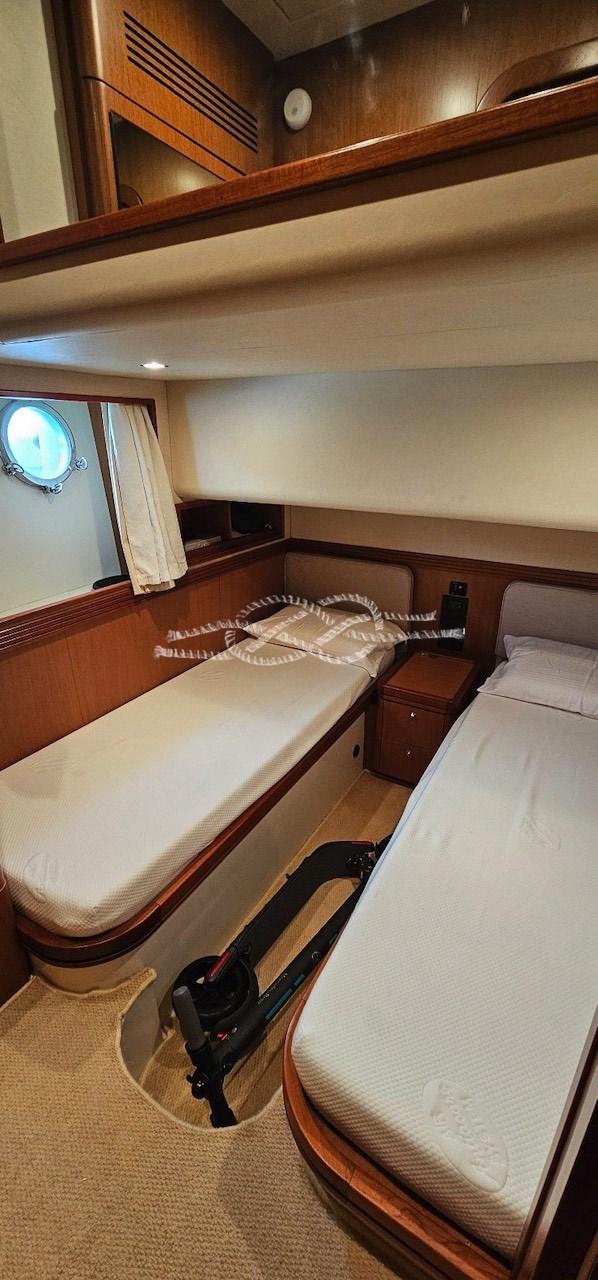 Cabina armatoriale con letto matrimoniale e bagno con box doccia (senza bidet) - cabina ospiti con due letti in piano - cabina ospiti con due letti incrociati - bagno ospiti con box doccia (senza bidet).
