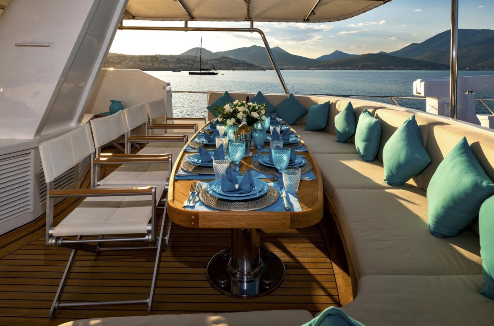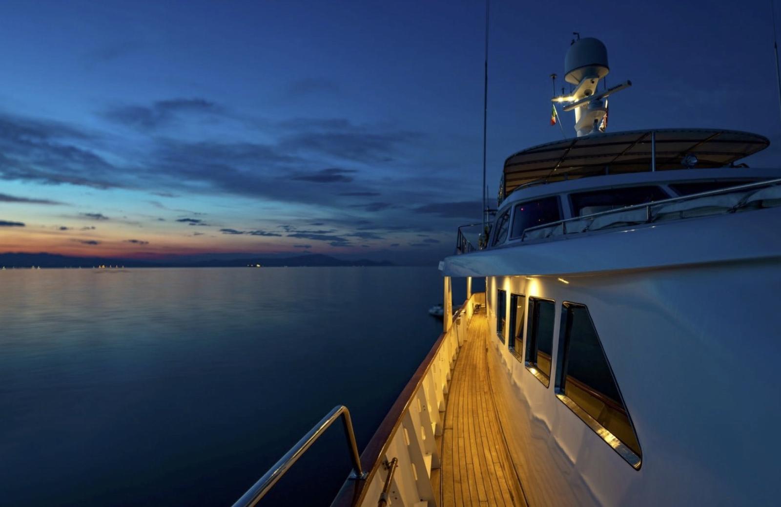Allarme motore, Allarme sentina, Autoclave, Camminamenti laterali in teak, Doccia esterna, Doppia timoneria, Elica di prua - bow thruster (Hysy), Gruette per tender, Impianto antincendio, Passerella, Piattaforma, Porta ingresso, Pozzetto Teak, Presa 220V banchina, Presa acqua banchina, Salpa Ancore Elettrico, Scala reale, Scaletta da bagno, Stabilizzatori (Siemens), Tavolo pozzetto, Tender, Tromba, Winch tonneggio di poppa.