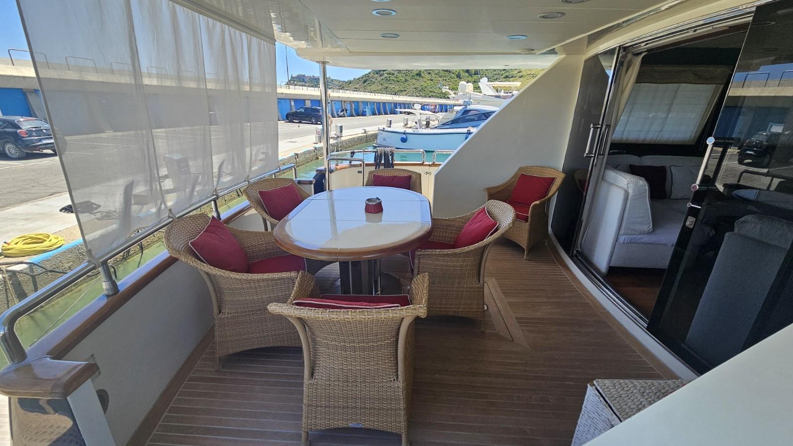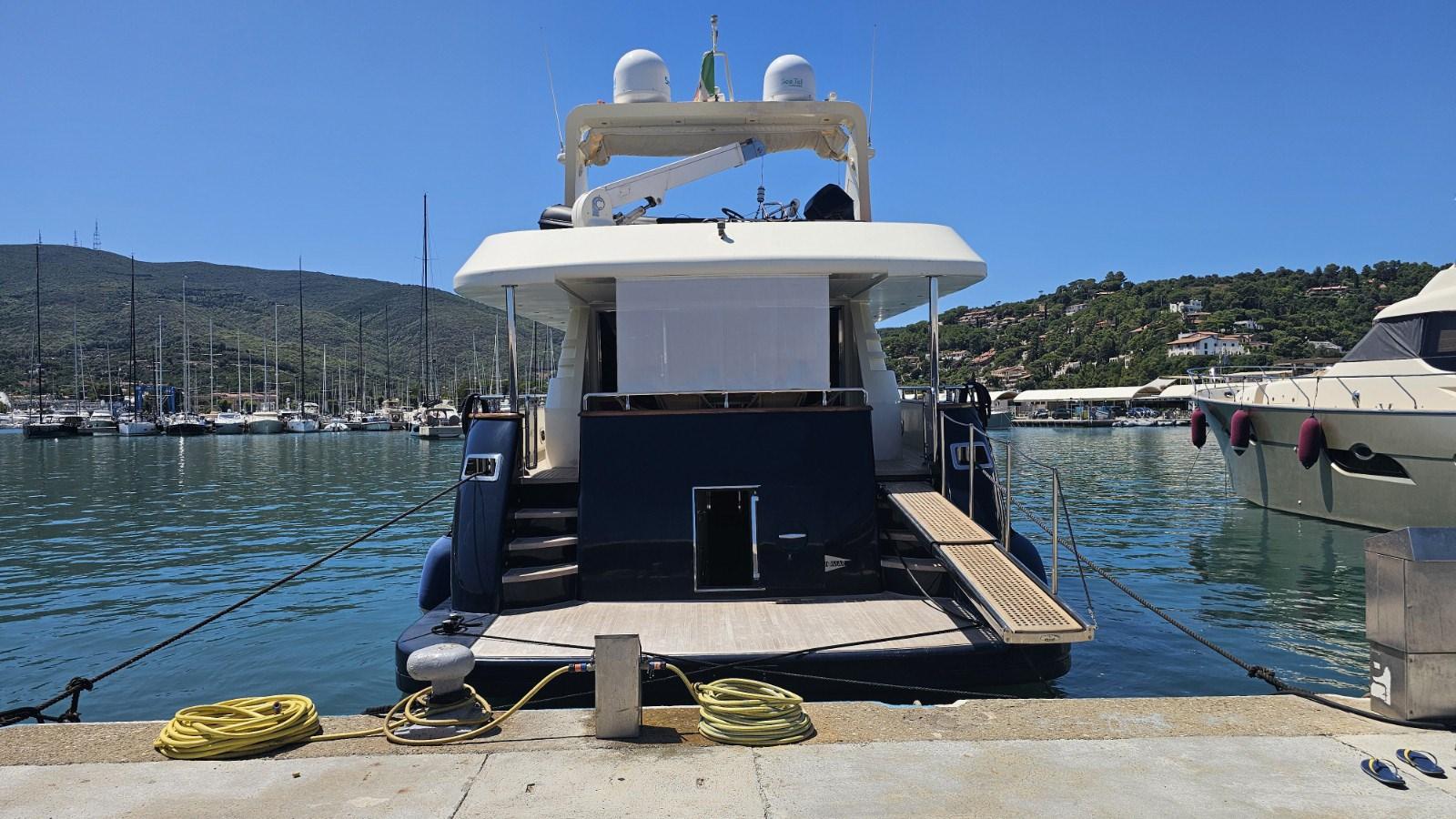 Allarme motore, Allarme sentina, Autoclave, Bocche di Lupa, Doccia esterna, Doppia timoneria, Flap idraulici, Gruette per tender su fly, Impianto antincendio, Luci di cortesia, Passerella, Piattaforma, Porta ingresso, Porta laterale, Pozzetto Teak, Presa 220V banchina, Presa acqua banchina, Rollbar, Salpa Ancore Elettrico, Scaletta da bagno, Selle per Tender, Tavolo pozzetto, Tender, Tromba, Winch tonneggio di poppa.