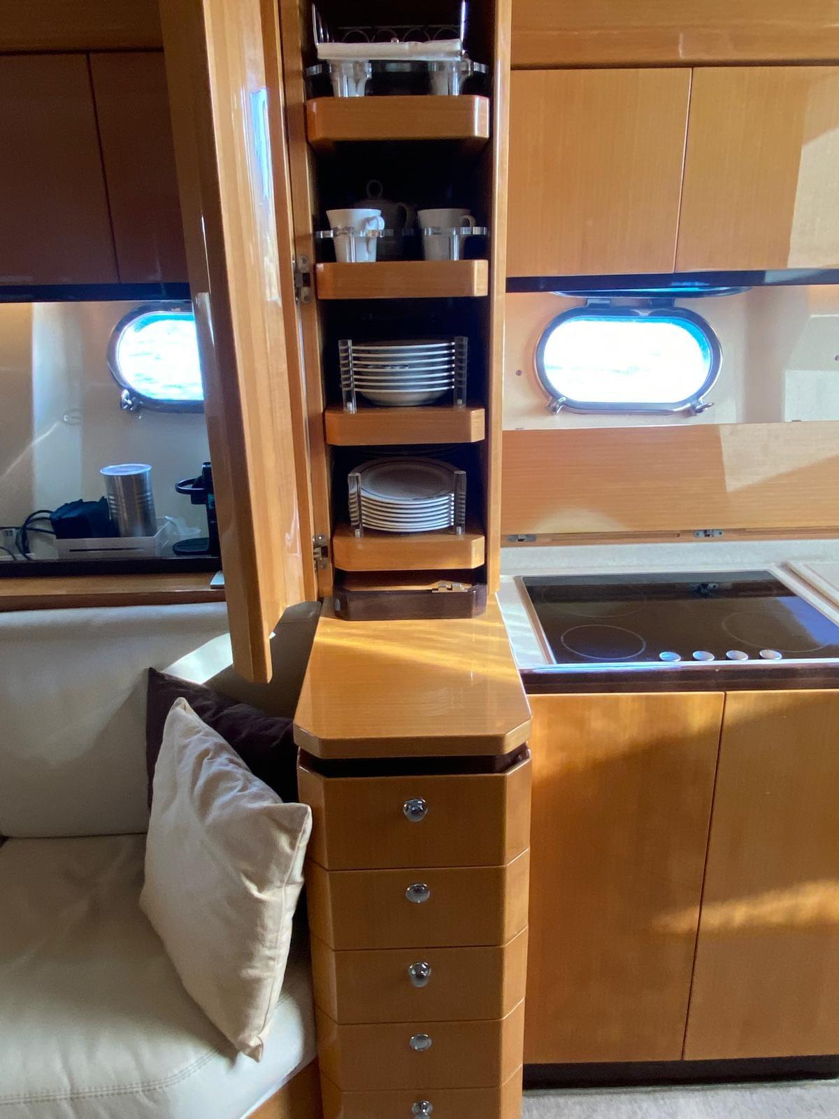 Elica di prua elettrica - hard top rigido ad apertura elettrica - aria condizionata - gruppo elettrogeno Mase 12 kW - mobile bar in pozzetto con frigo e piastra elettrica due fuochi - antenna TV SAT - TV LCD - forno microonde combinato - piano cottura 4 fuochi elettrico - frigo - freezer - passarella elettro idraulica a scomparsa.