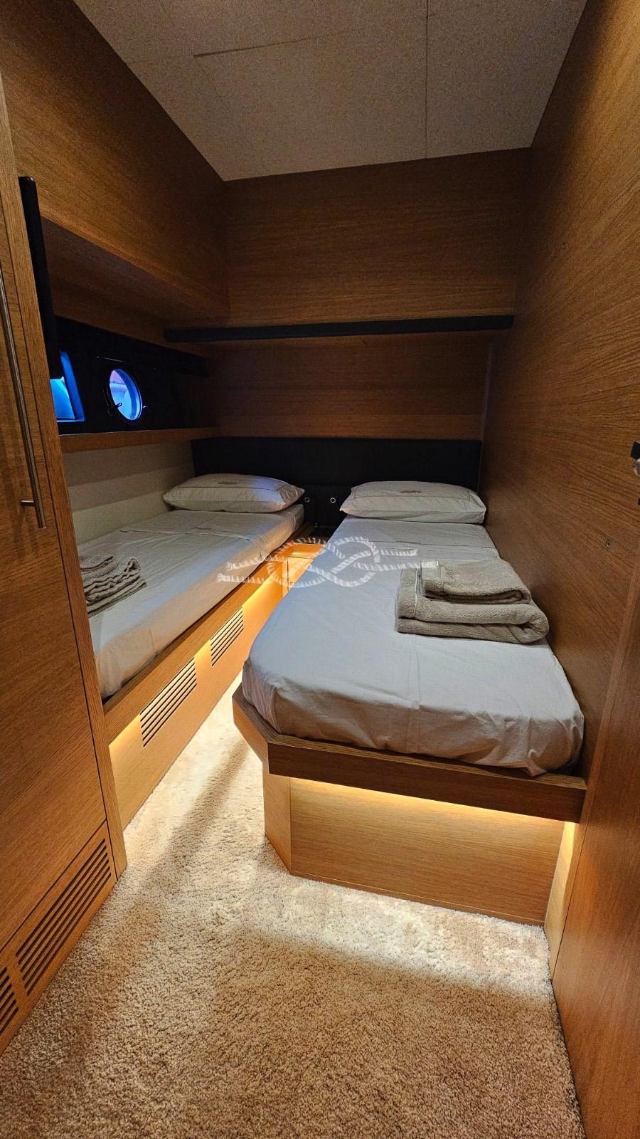 Cabina armatoriale con letto matrimoniale e bagno - cabina Vip con letto matrimoniale e bagno - cabina ospiti con due letti in piano e bagno.