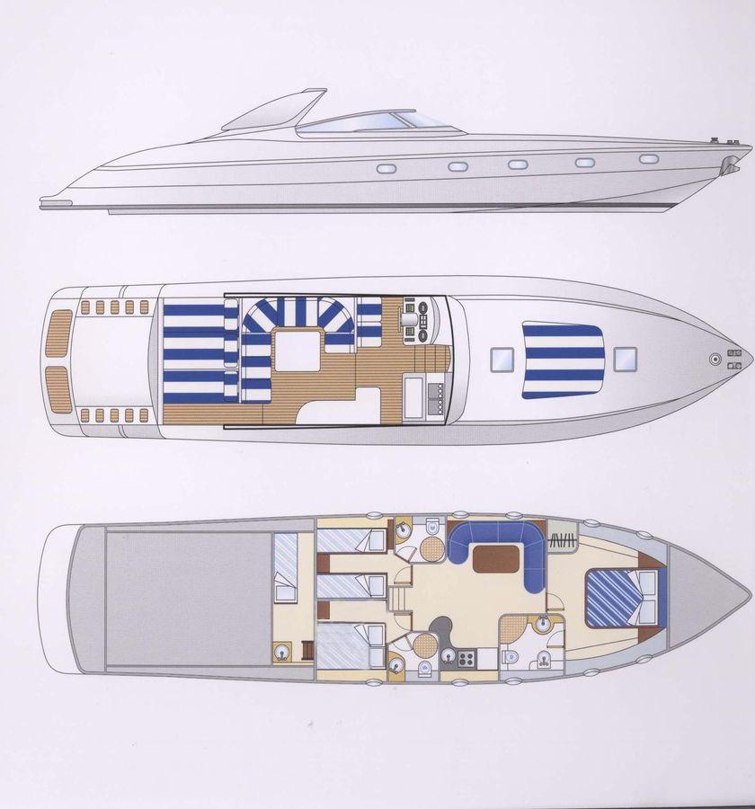 Cabina armatoriale con letto matrimoniale e bagno - cabina ospiti con letto alla francese - cabina ospiti con due letti in piano - bagno ospiti.