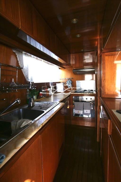 Cucina con accesso diretto al pozzetto - cabina equipaggio a prua per due con bagno - cabina equipaggio con letto alla francese a poppa con bagno.