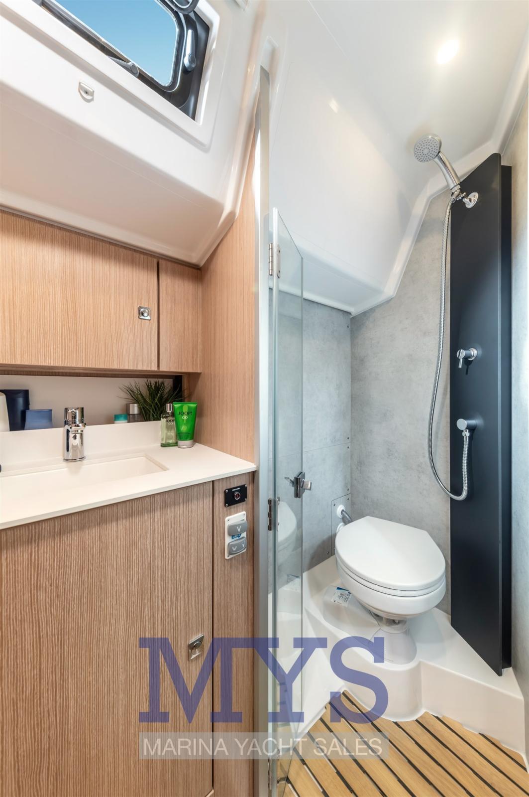 Allarme motore, Allarme sentina, Autoclave, Doccia esterna, Doppia timoneria, Luci di cortesia, Piattaforma, Pompa di sentina automatica, Pompa di sentina manuale, Porta ingresso, Pozzetto Teak, Presa 220V banchina, Salpa Ancore Elettrico, Sartiame spiroidale, Scaletta da bagno, Tavolo pozzetto.
