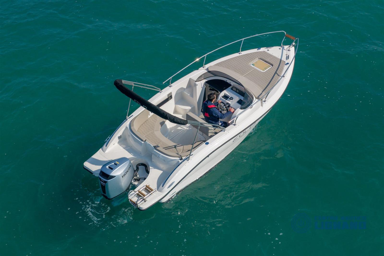 Eolo 6.4 EL 2026 nuova completa con motore fuoribordo Honda Marine BF150 silver, elica in acciaio inox, completa di cuscineria beige texture lamborghini, impianto carburante 96 lt, impianto idrico e doccia 39 lt, tendalino inox 3 archi nero, passo uomo, timoneria idraulica, plancette di poppa con scaletta di risalita, luci regolamentari navigazione e fonda, luci di cortesia in cabina, scafo bianco, musone prua, ancora manuale, presa 12V, impianto elettrico 12V con pannello, bussola, WC chimico, fuoribordo nuovo Honda Marine BF150 Silver Aquamarine, primo strumento SVH85.