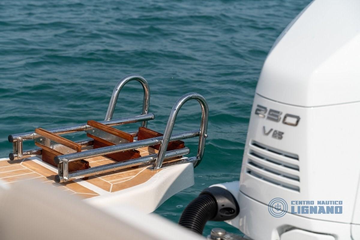 Gli accessori compresi sono: carena bianca, cuscinerie beige con texture lamborghini, Roll-bar inox satinato nero con tendalino, console verniciata nera, teak sintetico pozzetto e gradini, verricello elettrico con ancora e catena, impianto acque nere e WC marino elettrico, passo uomo, oblò, finestrature in plexiglass, frigo, prendisole di prua, corrimano prua, musone prua, bitte, ganci di alaggio, tavolo con piede, prolunga prendisole di poppa, scaletta bagno in acciaio inox, iImpianto carburante lt 270, impianto idrico e doccia lt 67, impianto elettrico completo di bussola tromba, luci di via, luci di cortesia, luce 360°, presa di corrente 12 V, pompa di sentina, deviatore batteria, plancette di poppa con rivestimento in teak sintetico.