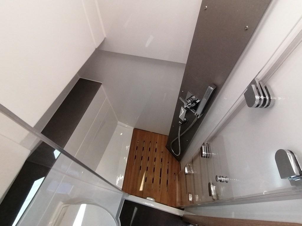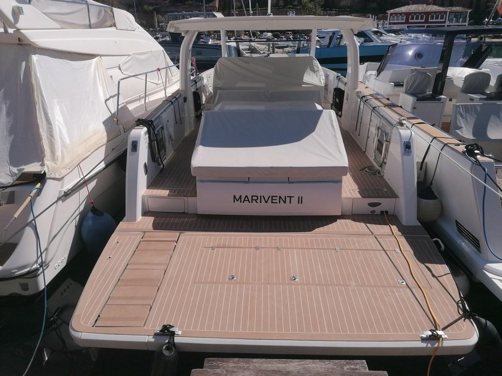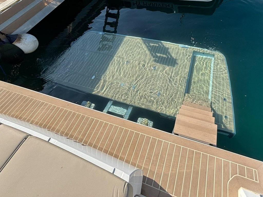 Allarme motore, Allarme sentina, 2 Alternatore, Aspirazione dal Ponte delle Acque Sporche, Auto Dynamic Trim Interceptor (with Auto trim, List and Coordinated Turn), Autoclave, 4 Batterie (x160Ah AGM service bank), 8 Bitte Abbattibili, Bocche di Lupa, Caricabatterie (Mastervolt), Cavo corrente di banchina, Doccia esterna, 2 Flap di assetto, Impianto antincendio (fire buoy), Lavandino nel Pozzetto, Luci di cortesia (Indirect light package: multicolour on handrails on side deck and sunbed and white colour on dashboard), Luci subacquee (multicolor), Monitor batteria (Mastervolt), 8 Parabordi, Passerella (telescopic hydraulic), Piattaforma (extended hydraulic tender lift), 2 Pompa di sentina automatica, 3 Pompa di sentina elettrica, Pompa di sentina manuale, Ponte in teak (Flexiteak), Ponte in teak (synthetic Flexiteak), Porta ingresso (sliding), 2 Presa 220V banchina, Salpa Ancore Elettrico, Scaletta da bagno (foldbale), Stabilizzatori (Quick gyro (12V or 230V)), 2 Tavolo pozzetto, 2 Tientibene con cancelletti, Tromba, T-Top (Full beam T-Top with windshield frame and wiper cover).
