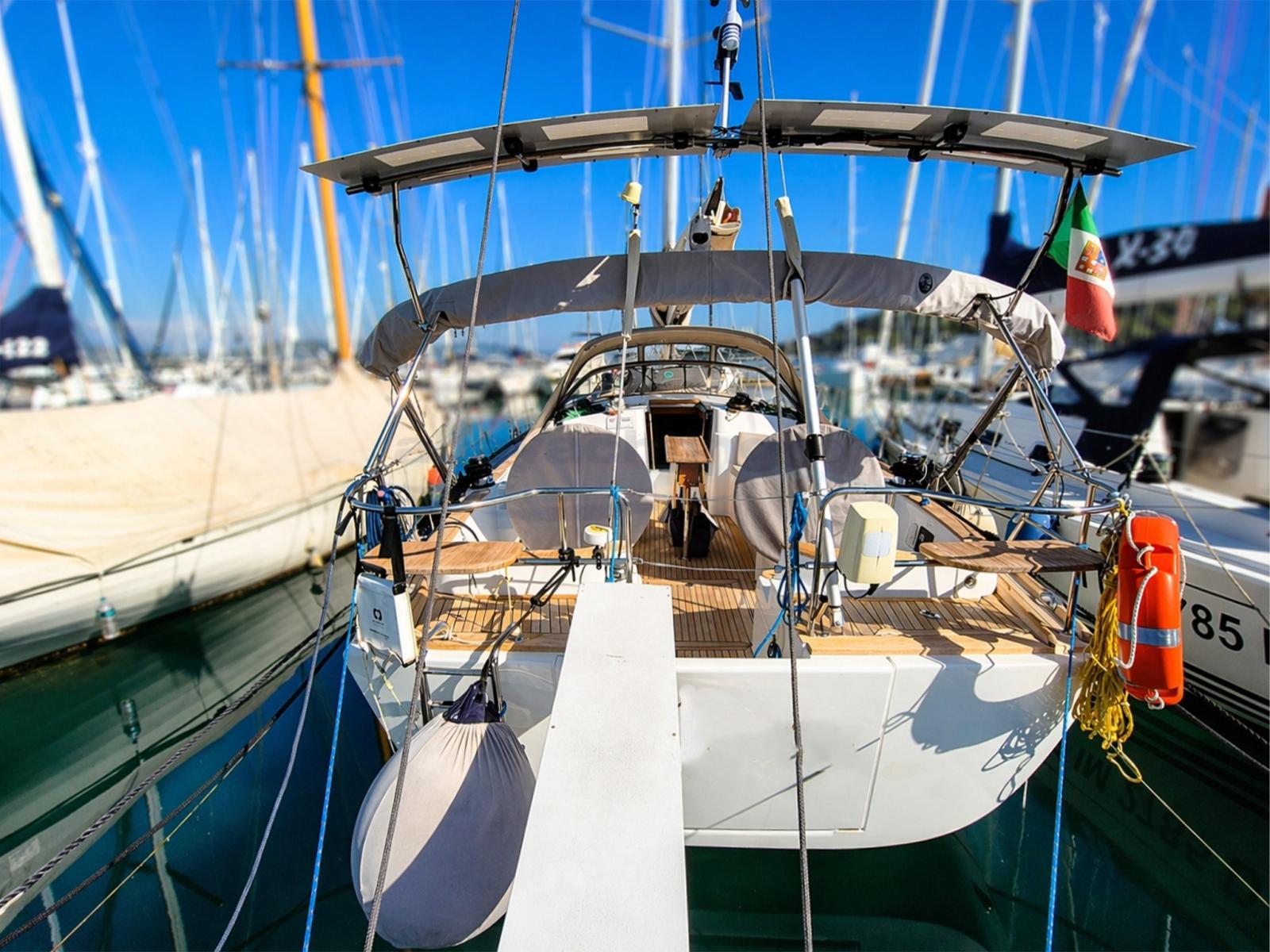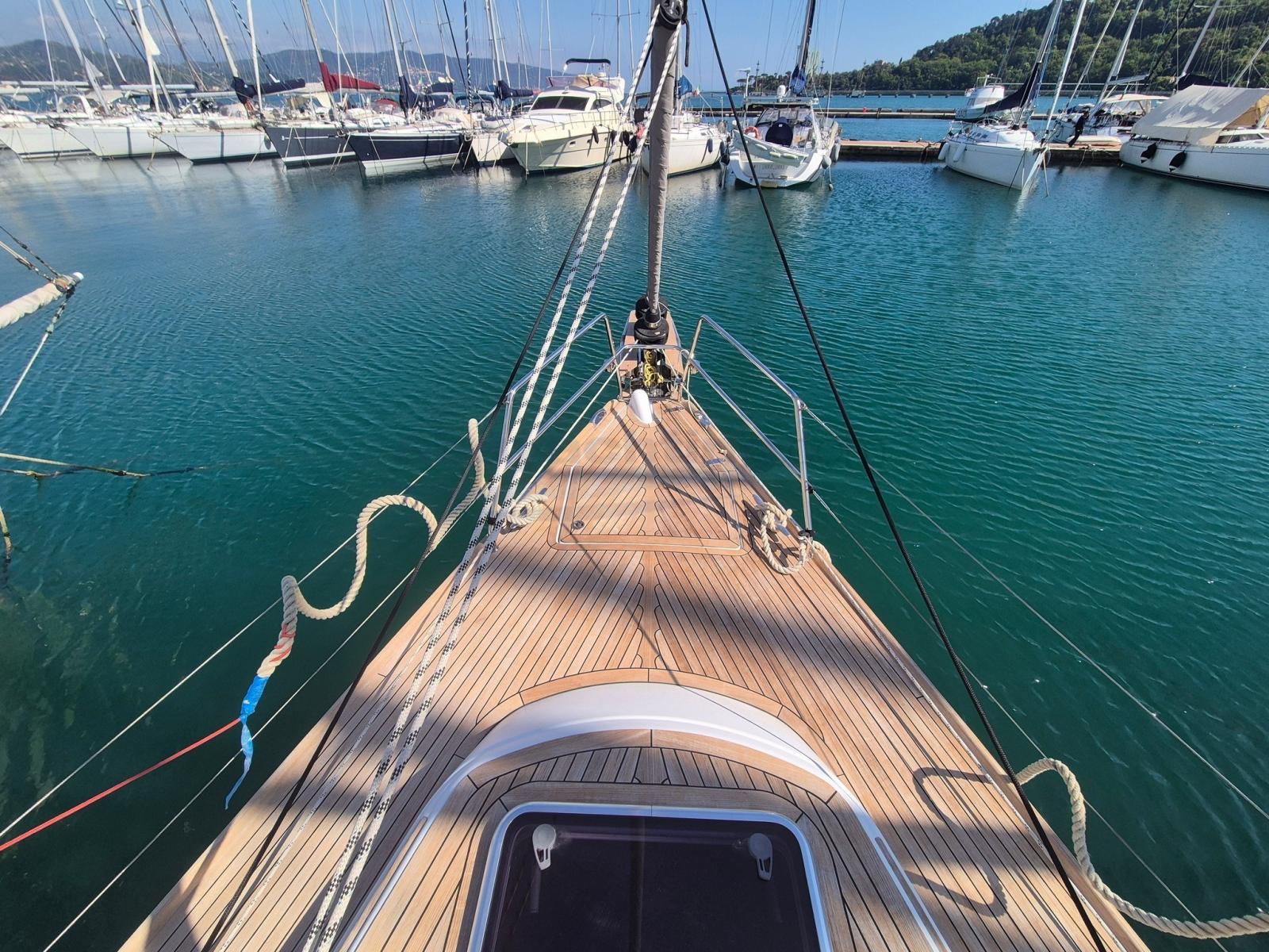 Moody 41 Aft Cockpit con randa steccata, fiocco autovirante, genoa e gennaker Quantum, una configurazione completa che rende la navigazione semplice e piacevole in ogni situazione.
