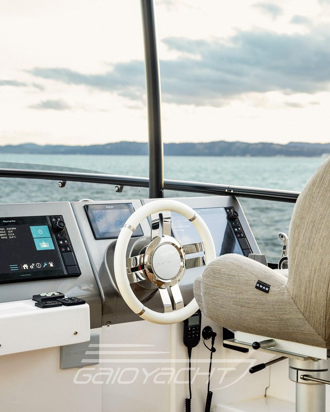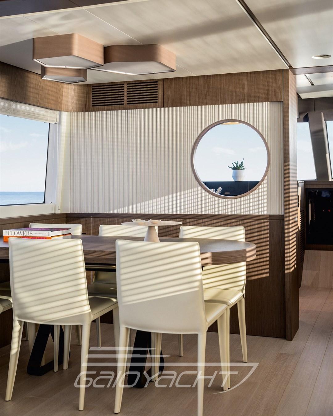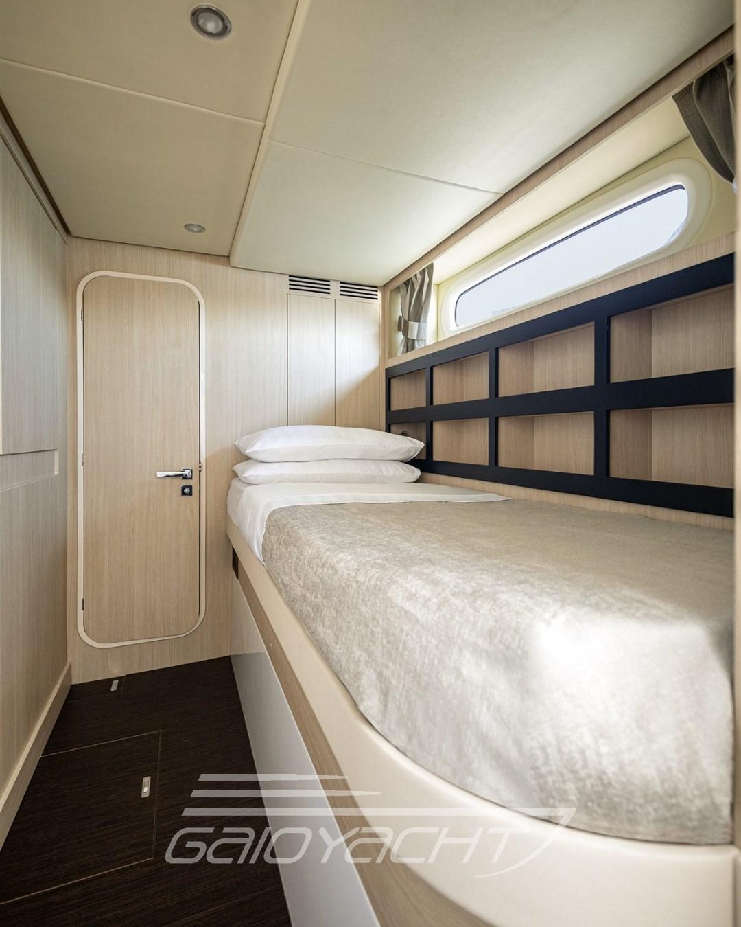Controllo automatico assetto; Asta porta bandiera; Luci di manovra; Mobile con tv da 43''; Pacchetto lucu Luxury per esterni e interni; Tavolo prua con sistema sali e scendi elettrico; Pavimento fly in teak; Tenda privacy in pozzetto; Bidet nel bagno armatore; Quarta cabina in versione 2 letti; Sedie per tavolo pranzo; Tende veneziane in salone; Pavimento salone in legno; Remarine goald.