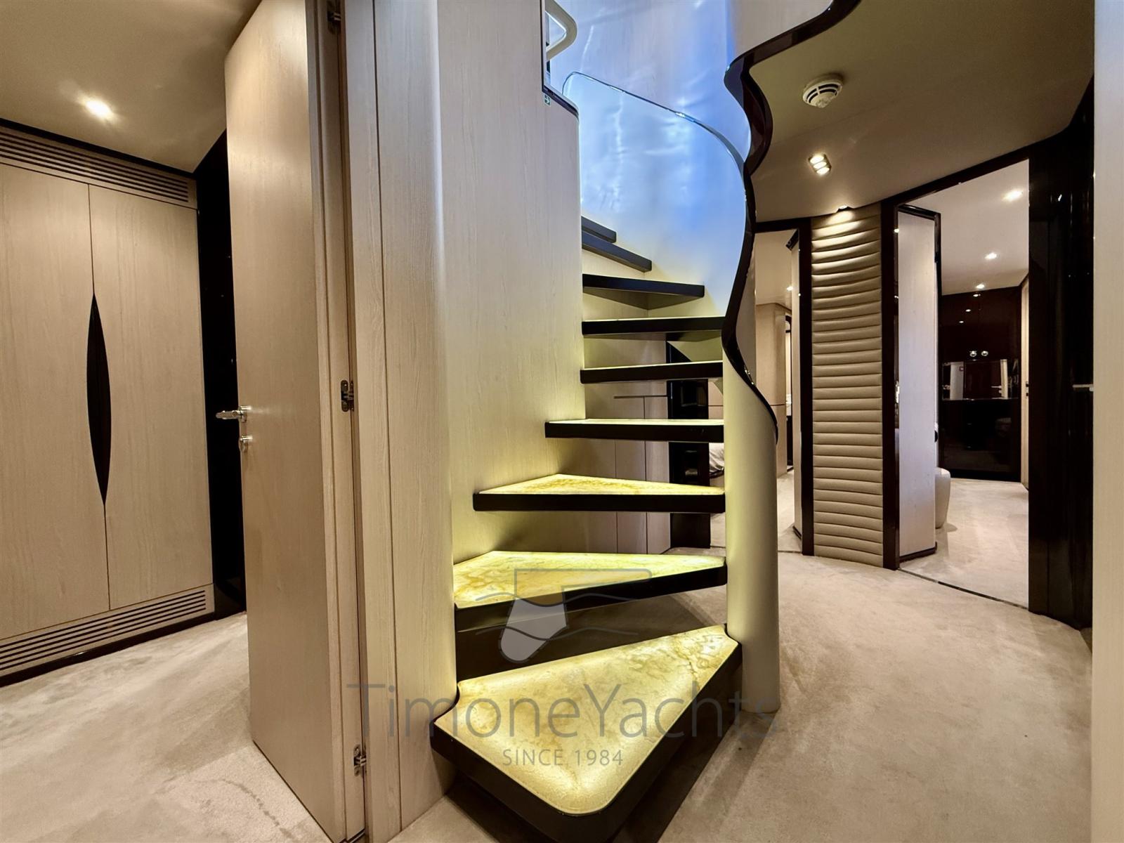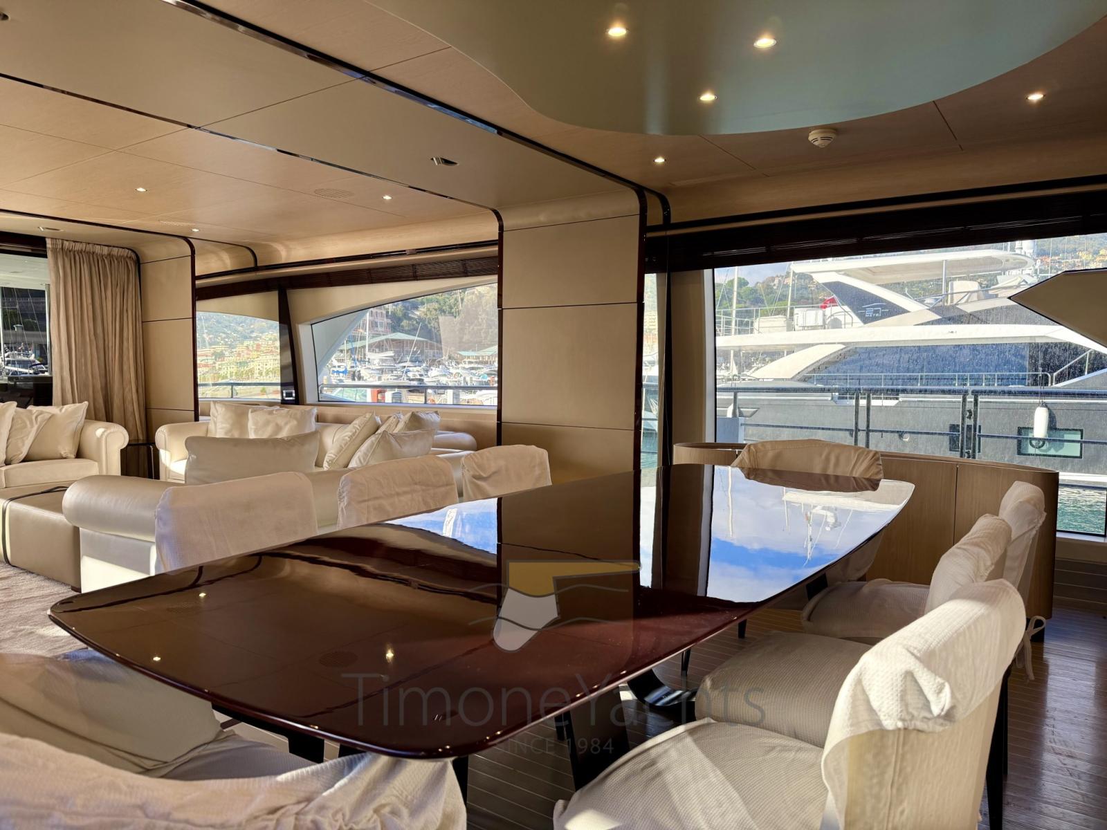 Camminamenti laterali in teak, Flap idraulici, Garage per tender, Hard top, Impianto antincendio, Indicatori Flaps, Lavaggio catena, Luci di cortesia, Luci subacquee, Pompa Lavaggio Ponte, Ponte in teak, 2 Porta laterale, Pozzetto Teak, Presa acqua banchina, Stabilizzatori, Tavolo pozzetto, Tender (Williams 445 DieselJet), Winch tonneggio di poppa, Winch tonneggio di prua.