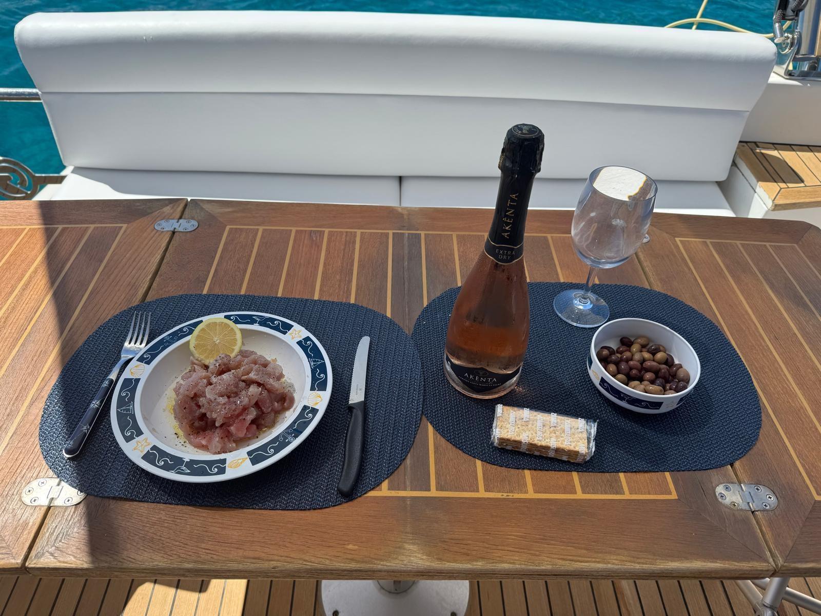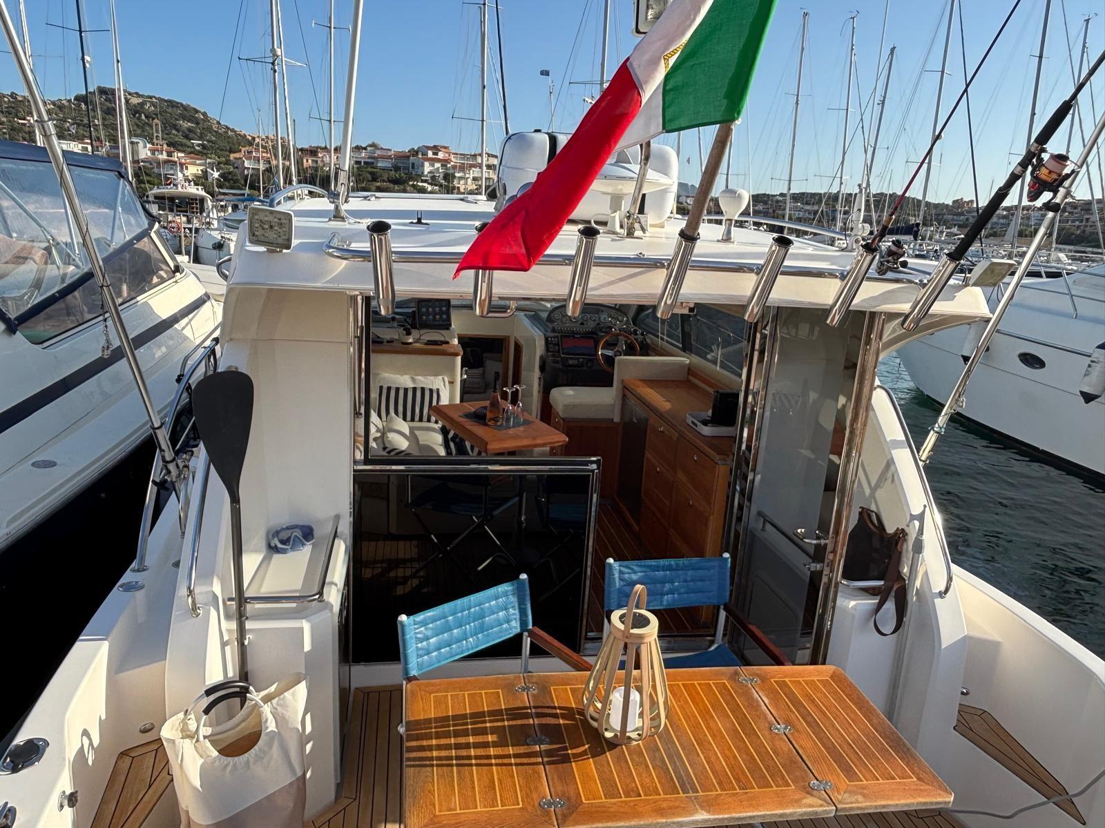 Allarme motore, Allarme sentina, Alternatore, Autoclave, Cavo corrente di banchina, Doccia esterna, Fari fissi a poppa, Flap elettrici, Hard top, Impianto antincendio, Luci di cortesia, Luci subacquee, Parabordi, Passerella (Elettroidraulica a scomparsa), Piattaforma, Pompa di sentina automatica, Pompa di sentina manuale, Porta ingresso, Pozzetto aperto, Pozzetto Teak, Presa 220V banchina, Presa acqua banchina, Salpa Ancore Elettrico (Quick), Scaletta da bagno, Tavolo pozzetto (Allungabile), Tavolo Salone Abbattibile (Trasformabile), 2 Tettuccio apribile in salone, Tromba, Winch tonneggio di prua.