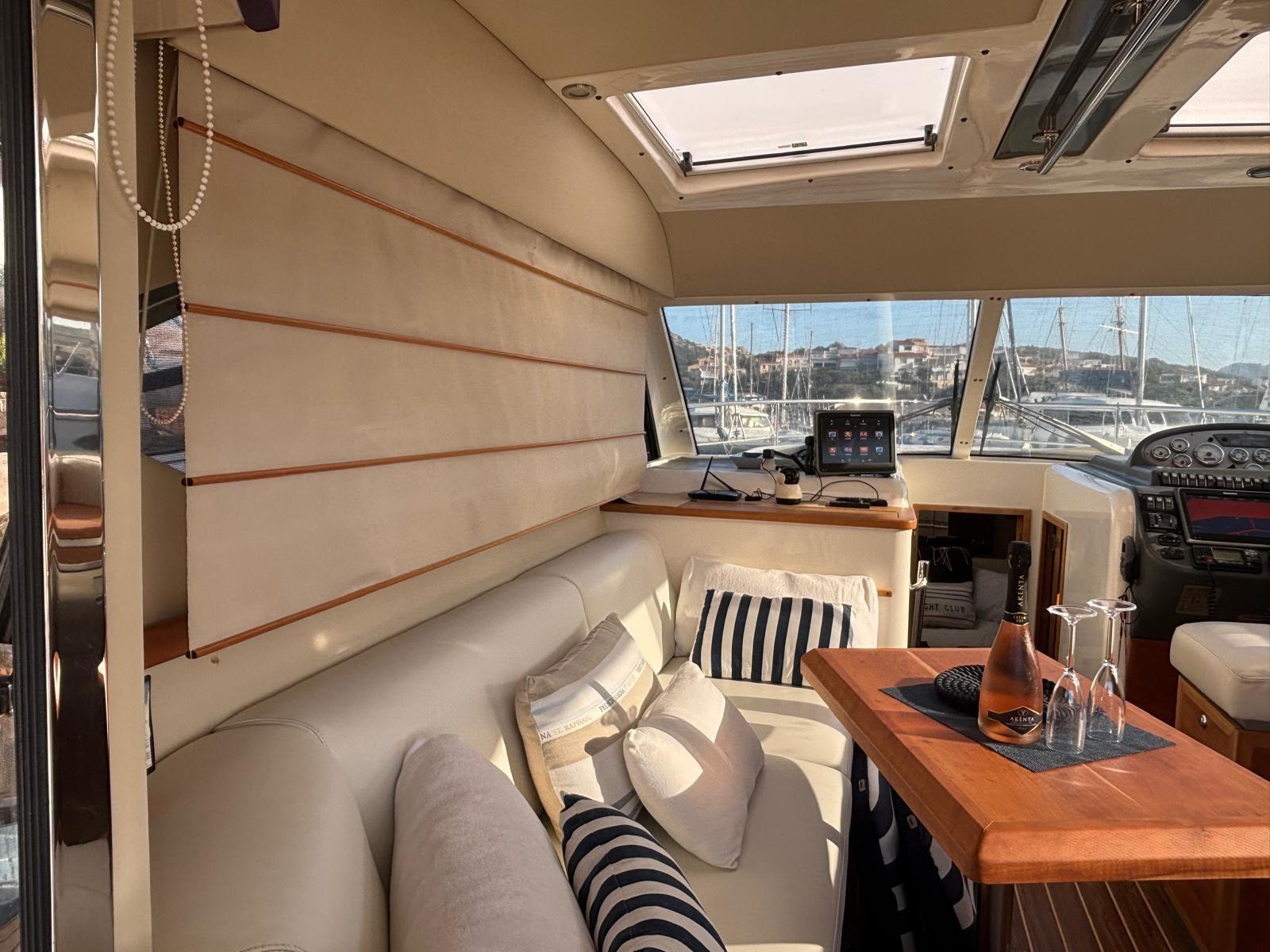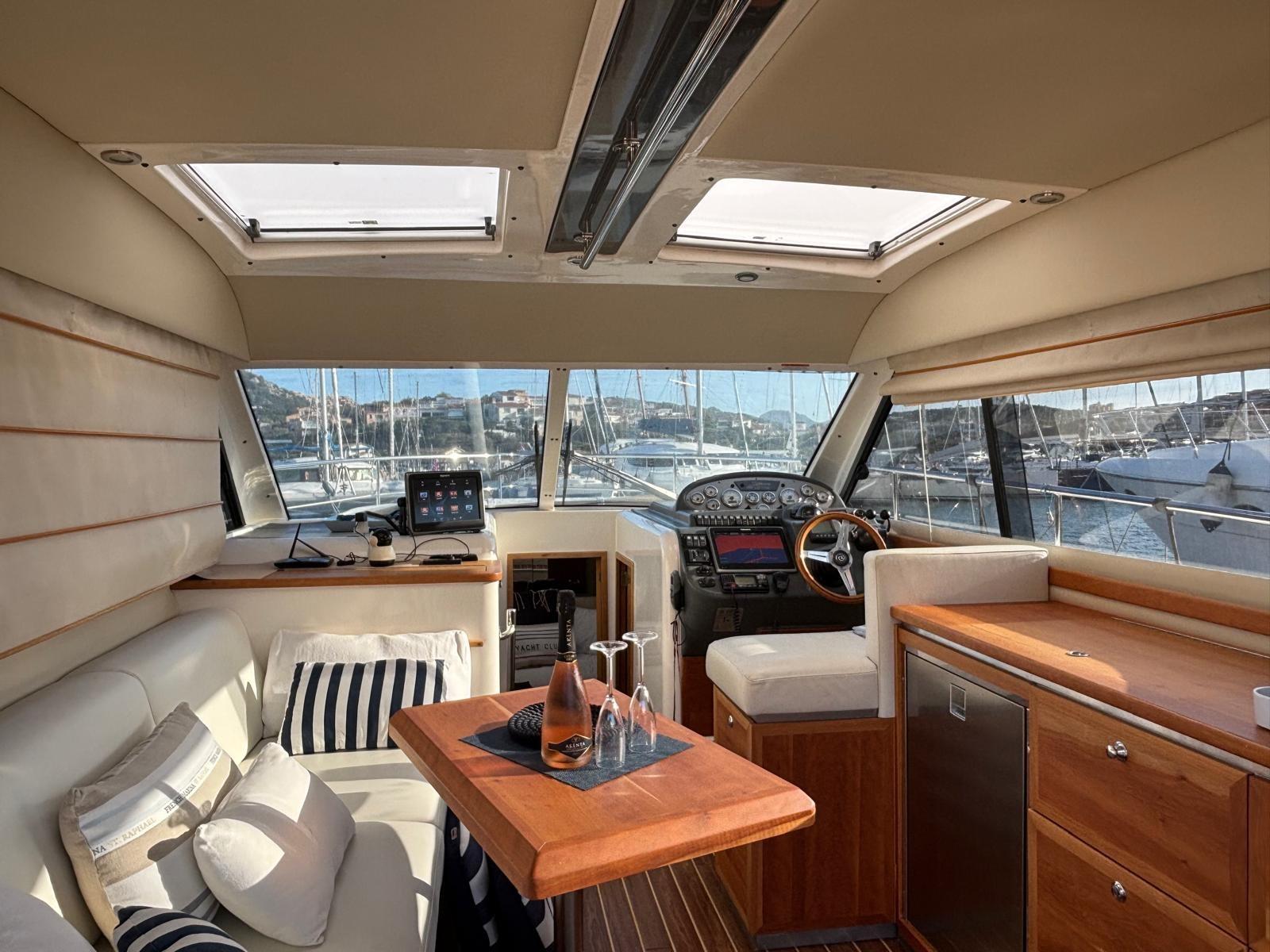 Bussola (Rotchie), Comando motori elettronico, Computer di bordo (Volvo Penta), 2 Contagiri (Volvo Penta), Contametri catena (Muir), Contaore, Ecoscandaglio (Raymarine), GPS (Raymarine), Mappe e guide, Pilota automatico (Raymarine), Plotter con antenna GPS (Raymarine), Quadro comandi, Radio VHF (Icom M423), Sedile Copilota.