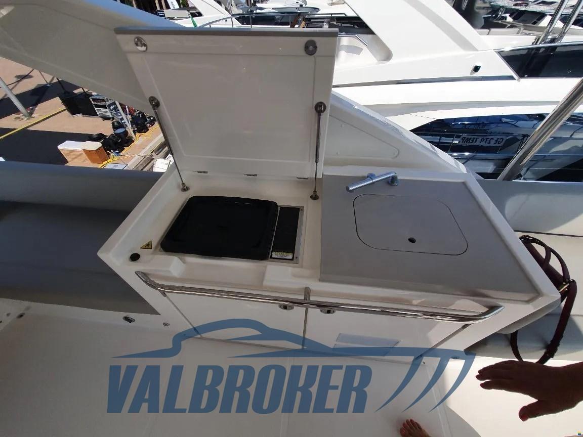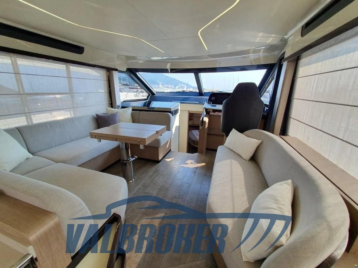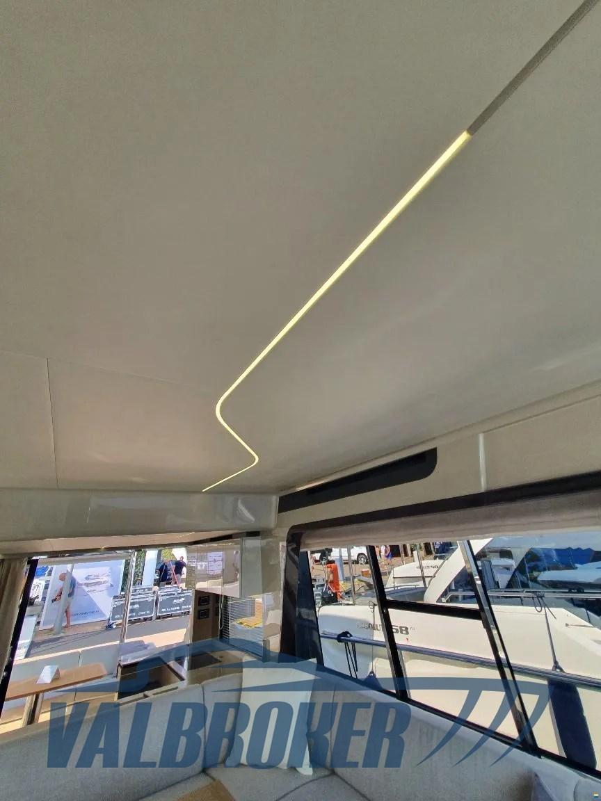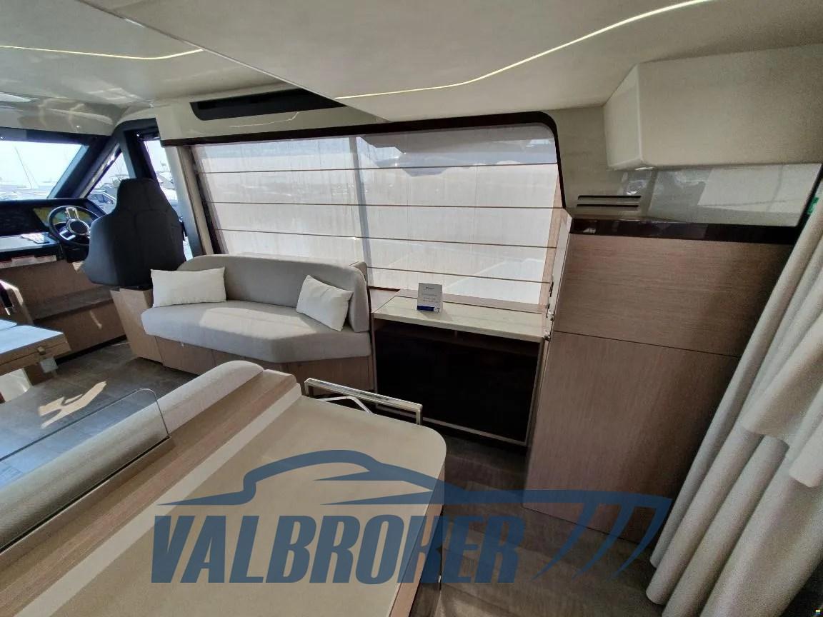 Volante in pelle con razze in acciaio sul ponte principale e volante in pelle idrorepellente con razze in acciaio sul flybridge, Gradini del flybridge in teak massello, Divano a U di prua color ecru in schiuma a rapido drenaggio con copertura grigio perla, Tavolo in teak di prua regolabile in altezza con cuscino sfoderabile color ecru in schiuma a rapido drenaggio per la trasformazione in prendisole con copertura grigio perla, Tende veneziane manuali per la finestra della cucina e tenda in tessuto manuale per la porta di accesso scorrevole