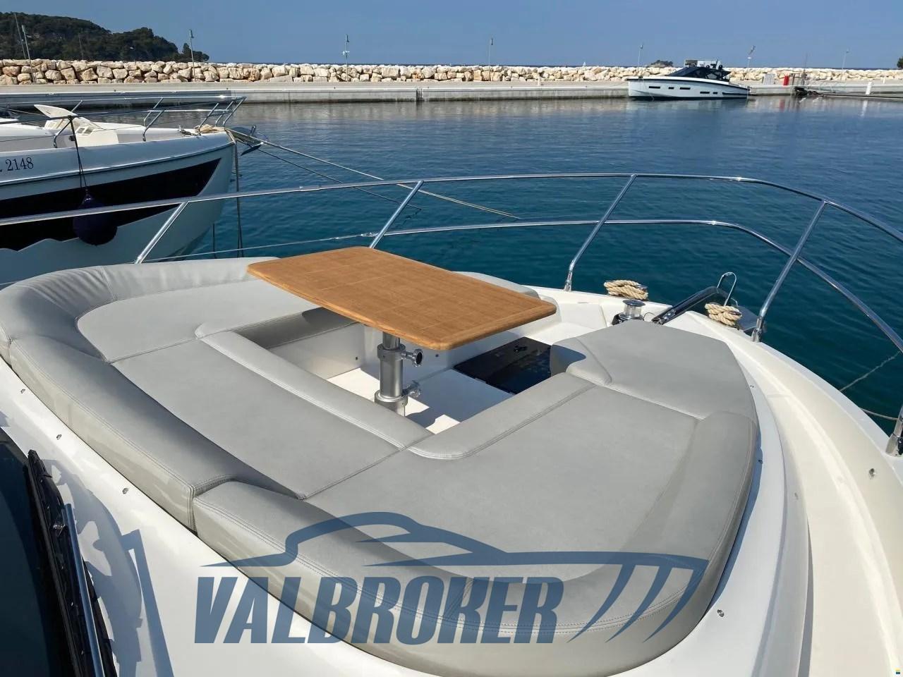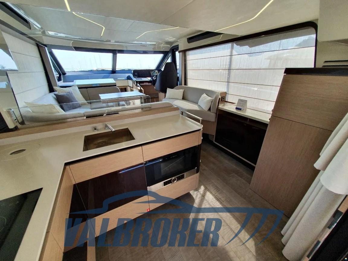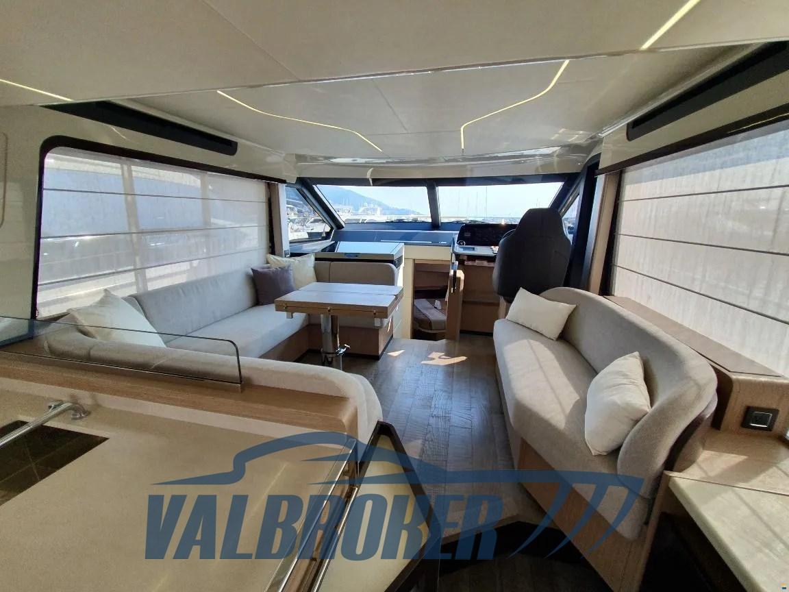 Volante in pelle con razze in acciaio sul ponte principale e volante in pelle idrorepellente con razze in acciaio sul flybridge, Gradini del flybridge in teak massello, Divano a U di prua color ecru in schiuma a rapido drenaggio con copertura grigio perla, Tavolo in teak di prua regolabile in altezza con cuscino sfoderabile color ecru in schiuma a rapido drenaggio per la trasformazione in prendisole con copertura grigio perla, Tende veneziane manuali per la finestra della cucina e tenda in tessuto manuale per la porta di accesso scorrevole