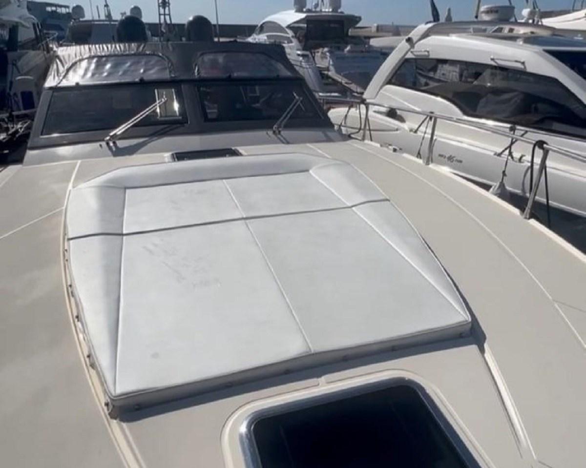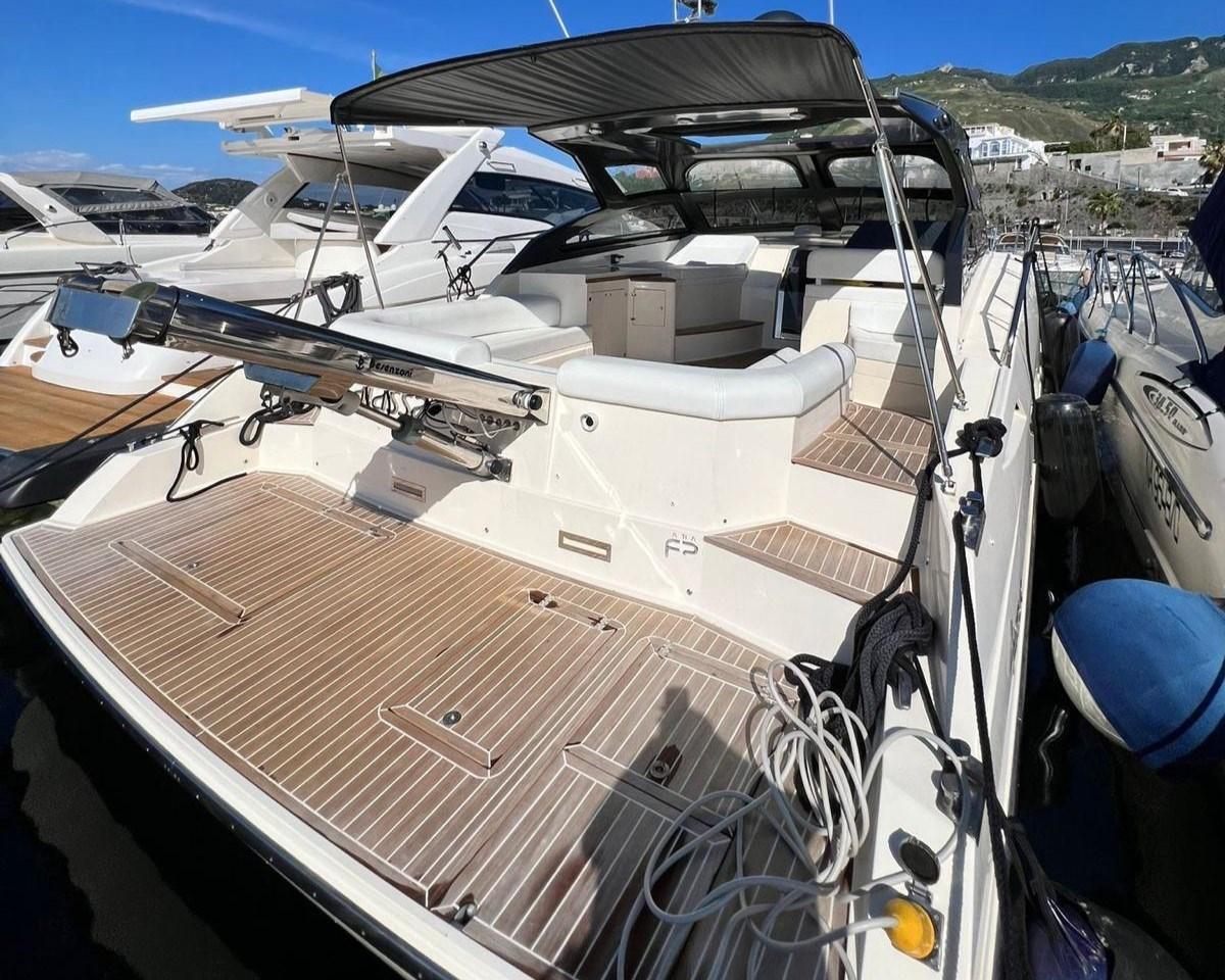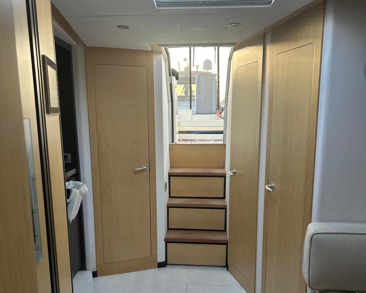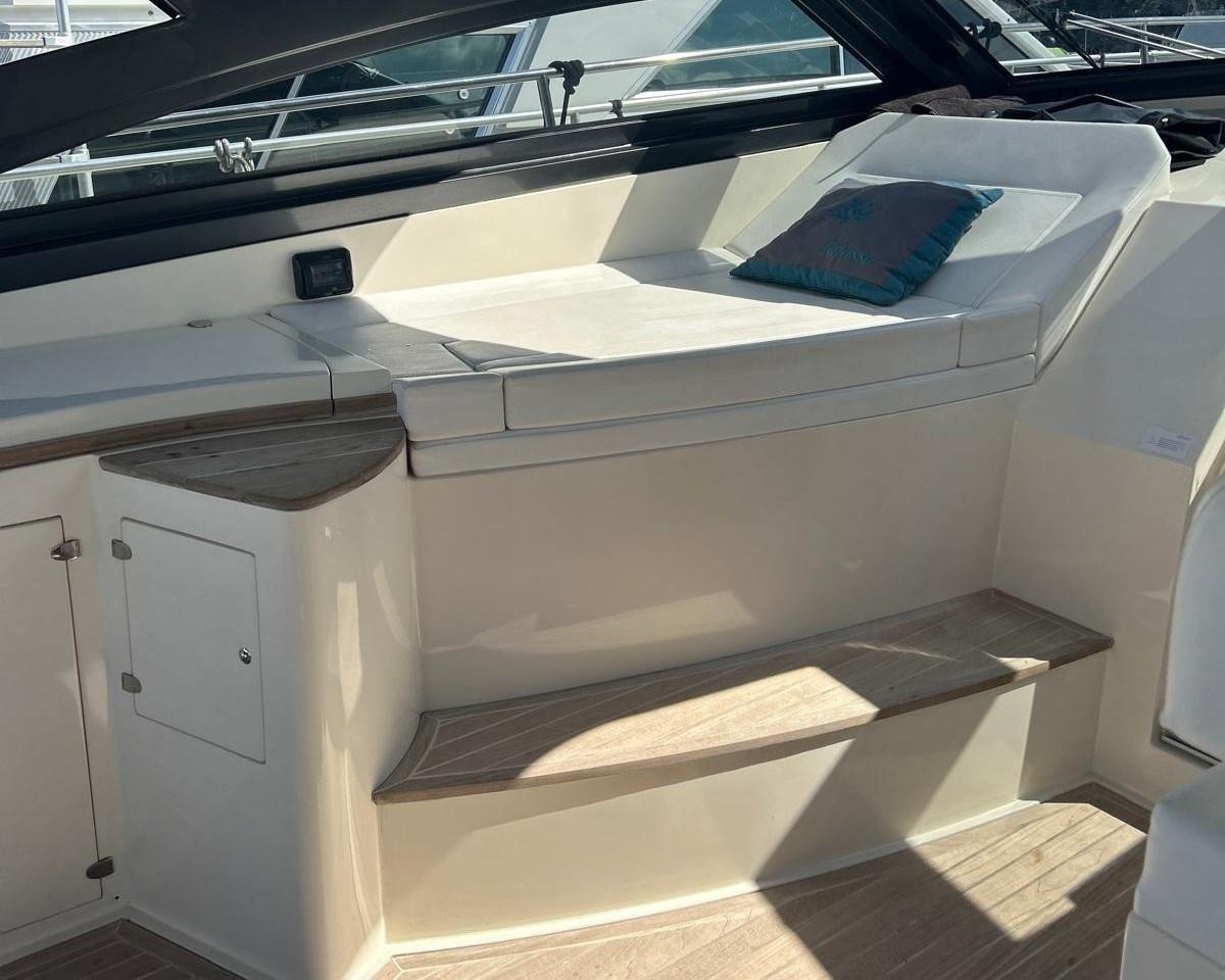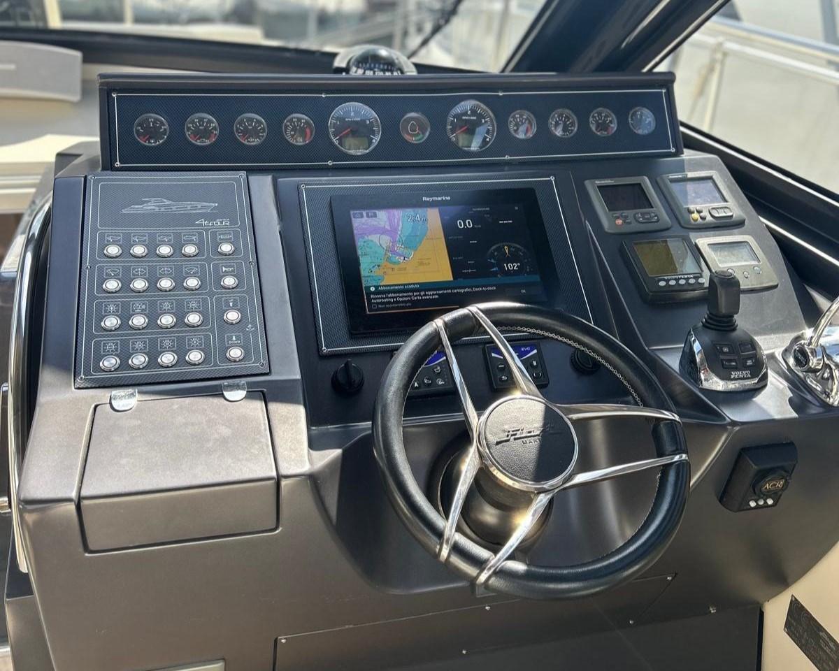 Timoneria situata a dritta, dotata di joystick per manovre facilitate (grazie ai motori IPS) e una chaise longue laterale per i passeggeri.
