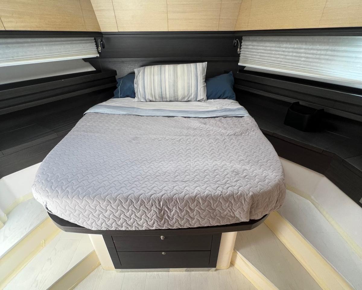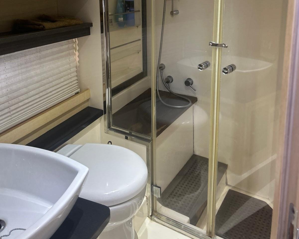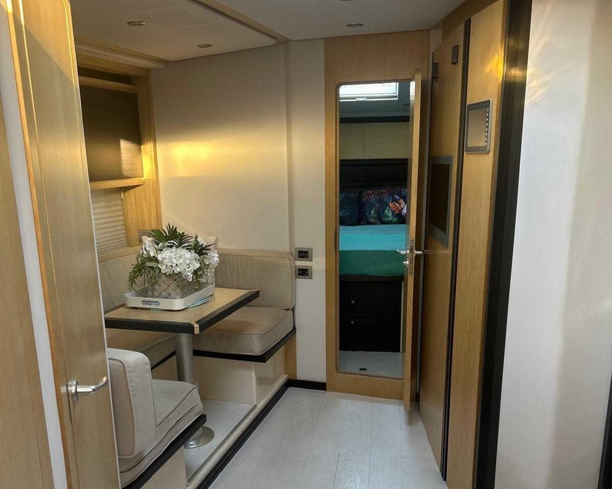 Ampia cabina armatoriale a prua, con letto matrimoniale centrale, oblò panoramici e bagno privato con box doccia separato.