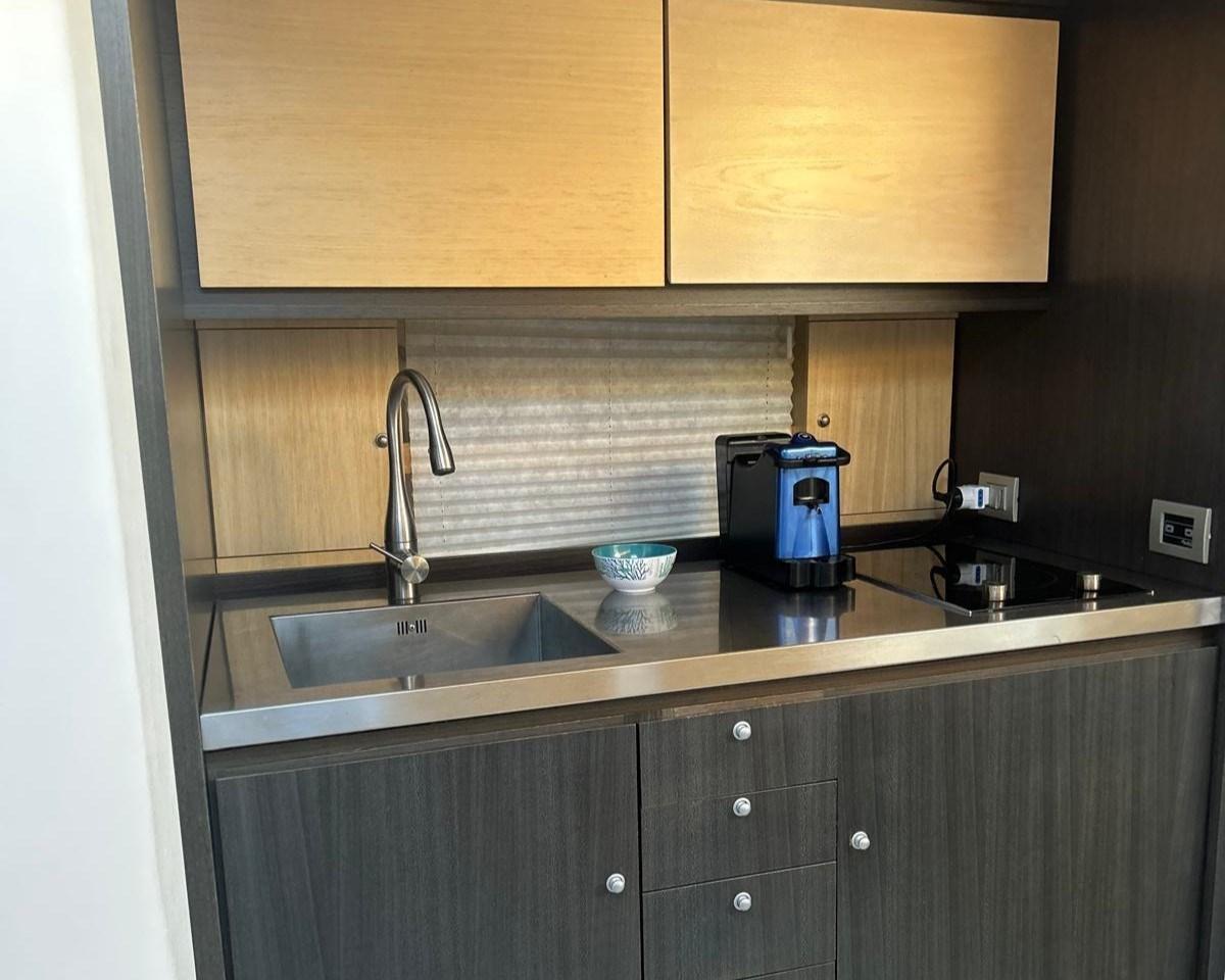 Mobile bar attrezzato con grill, lavandino e frigorifero a cassettoni in acciaio