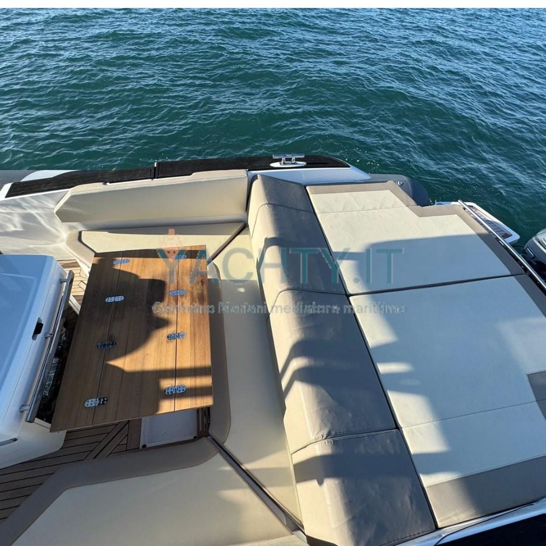 L’allestimento valorizza l’esperienza a bordo con T-Top dotato di vetro panoramico, servosterzo elettrico e manette elettroniche, mentre il teak in pozzetto contribuisce a creare un ambiente elegante e accogliente. La presenza della cabina aggiuntiva ricavata nel portellone poppiero amplia ulteriormente la vivibilità, rendendo l’imbarcazione ideale anche per weekend e permanenze prolungate.