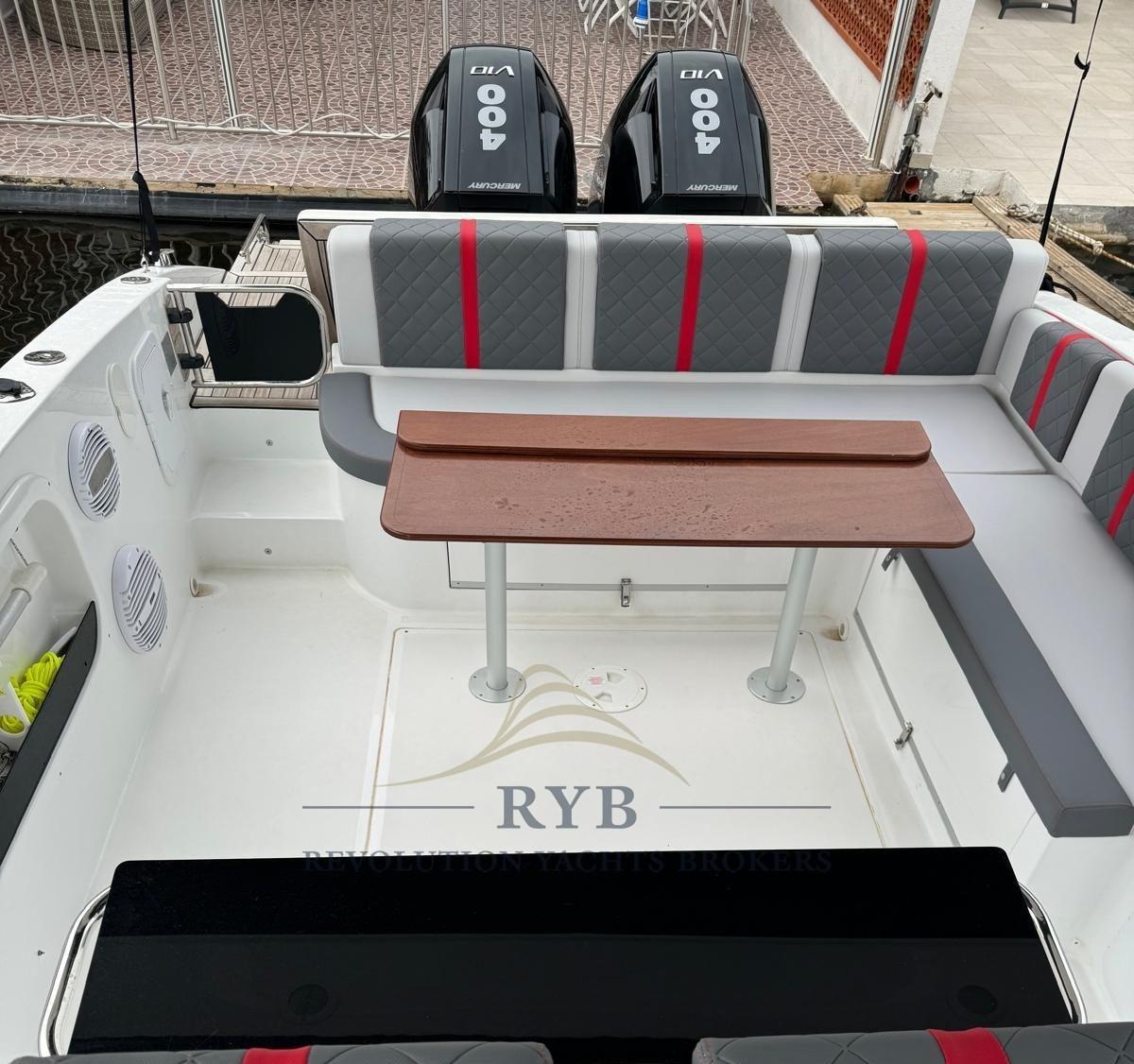 Faro orientabile, Flap elettrici, Lavandino nel Pozzetto, Luci di cortesia, Luci subacquee, Pannelli Solari, Piattaforma, Presa 220V banchina, Scaletta da bagno, Tavolo pozzetto, T-Top.