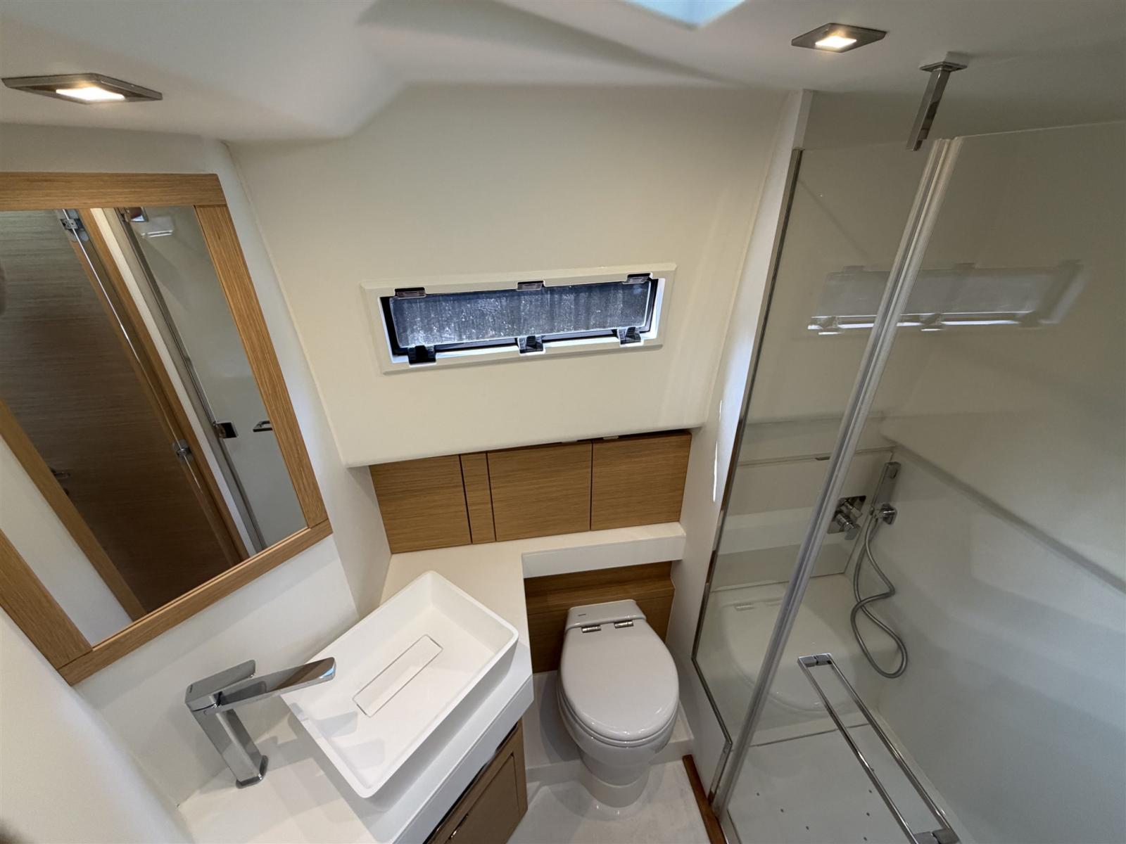 Acqua Calda, Clima reversibile, Controllo Domotica, Impianto acque nere, Indicatore del serbatoio del carburante, Indicatore del Serbatoio dell’Acqua, Indicatore del Serbatoio delle Acque Reflue, Indicatore della temperatura del motore, Pavimento interno in legno, Prese interne 12v, Prese interne 220v, Serbatoio Acque Nere, Sistema Idrico, Telecamera, Voltmetro, WC marino elettrico.