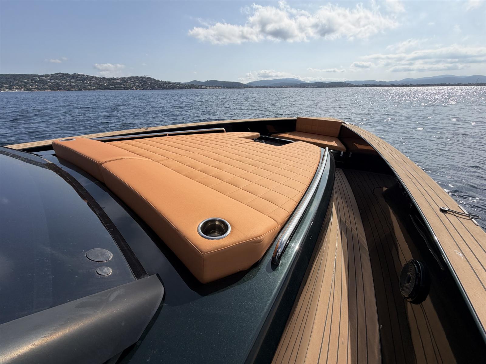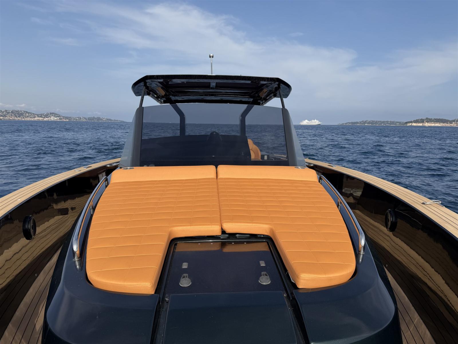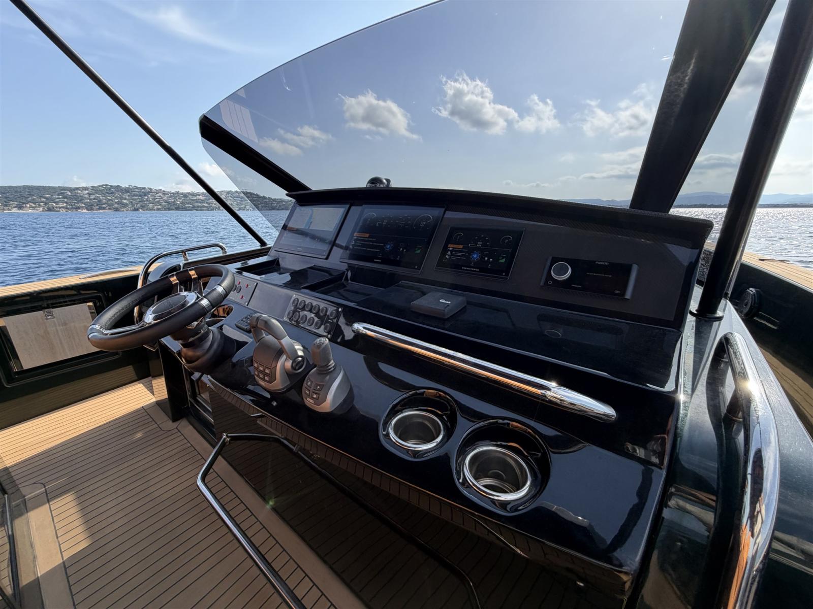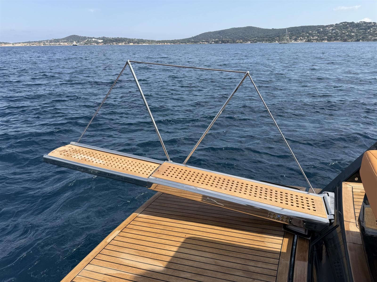 Allarme fumo/gas, Allarme motore, Allarme sentina, Aspirazione dal Ponte delle Acque Sporche, Auto Dynamic Trim Interceptor, Auto-Trim, Bitte Abbattibili, Bocche di Lupa, Cavo corrente di banchina, Doccia esterna, Fissaggio dell’ancora, Hard top, Impianto antincendio, Lavaggio catena, Lavandino nel Pozzetto, Luci di cortesia, Luci subacquee, Monitor batteria, Parabordi, Passerella, Piattaforma, Pompa di sentina automatica, Ponte in teak, Porta ingresso, Presa 220V banchina, Salpa Ancore Elettrico, Scaletta da bagno, Tavolo pozzetto, Tromba, T-Top.