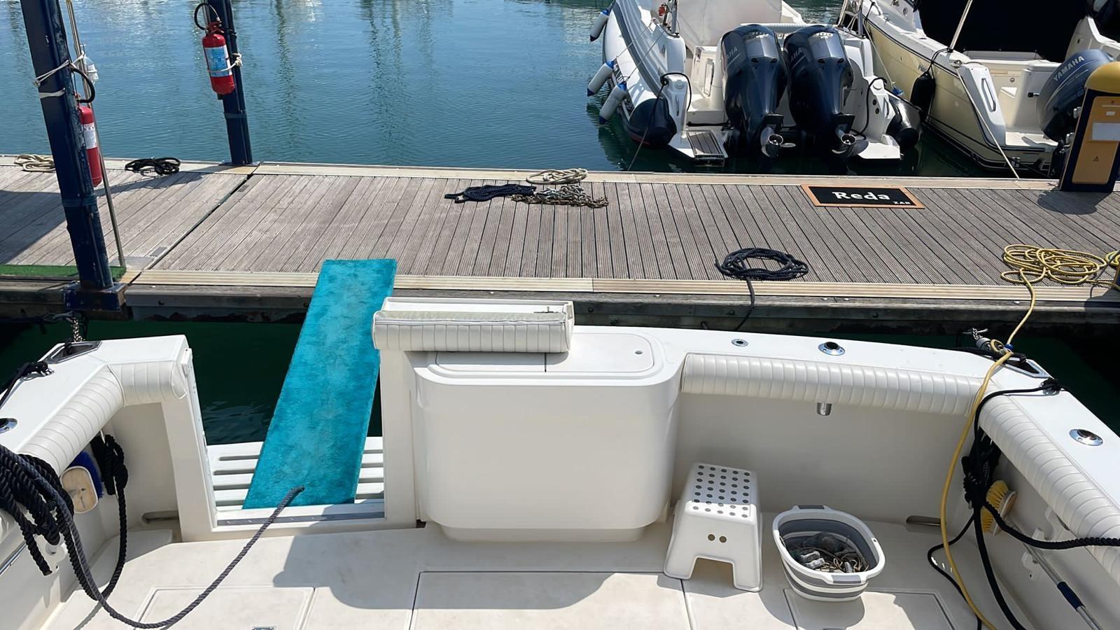 Allarme motore, Autoclave, Camminamenti laterali in teak, Colorazione speciale (Tiffany), Doccia esterna, Doppia timoneria, Elica di prua - bow thruster (tre comandi), Faro orientabile, Hard top, Lavandino nel Pozzetto, Luci di cortesia, Luci subacquee, Piattaforma, Pompa di sentina automatica, Porta ingresso, Presa 220V banchina, Presa acqua banchina, Salpa Ancore Elettrico, Scaletta da bagno, Tavolo pozzetto, Tromba.