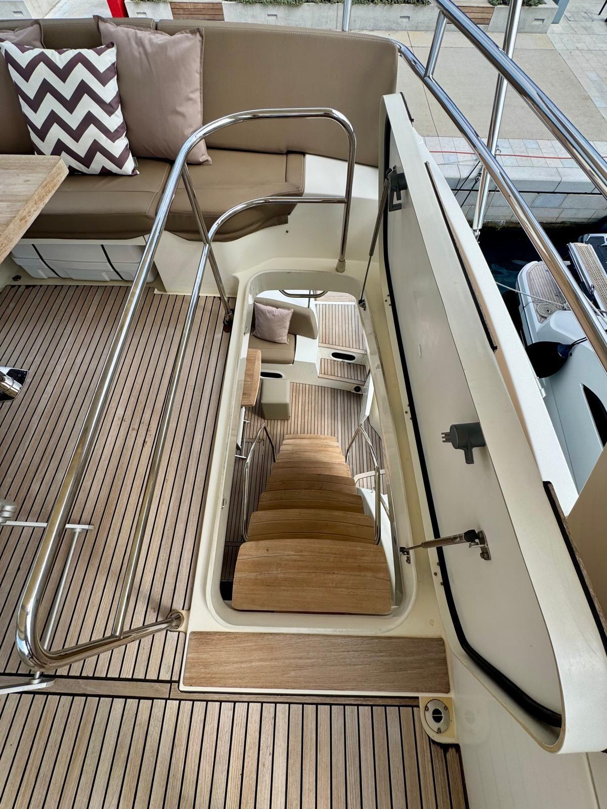 Allarme sentina, Camminamenti laterali in teak, Doccia esterna, Elica di prua - bow thruster (Max Power), Parabordi, Passerella, Pompa di sentina automatica, Pompa di sentina manuale, Pozzetto Teak, Salpa Ancore Elettrico, Scaletta da bagno, Tavolo pozzetto.