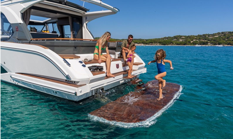 Tutto è pensato per facilitare il bagno in questo modello. Una piattaforma da bagno a comando idraulico facilita il sollevamento del tender grazie a un sistema di gruetta integrato (opzionale). La piattaforma è inoltre dotata di una scala da bagno, che consente di entrare e uscire dall'acqua facilmente e in tutta sicurezza. Le finiture sono curate nei minimi dettagli; ad esempio, i materassi del ponte di prua possono trasformarsi in giochi d’acqua grazie alla loro copertura impermeabile.